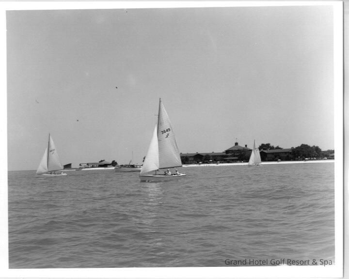 B&W photo - probably a July 4th regatta at Grand Hotel, Lightning Class circa 1950's