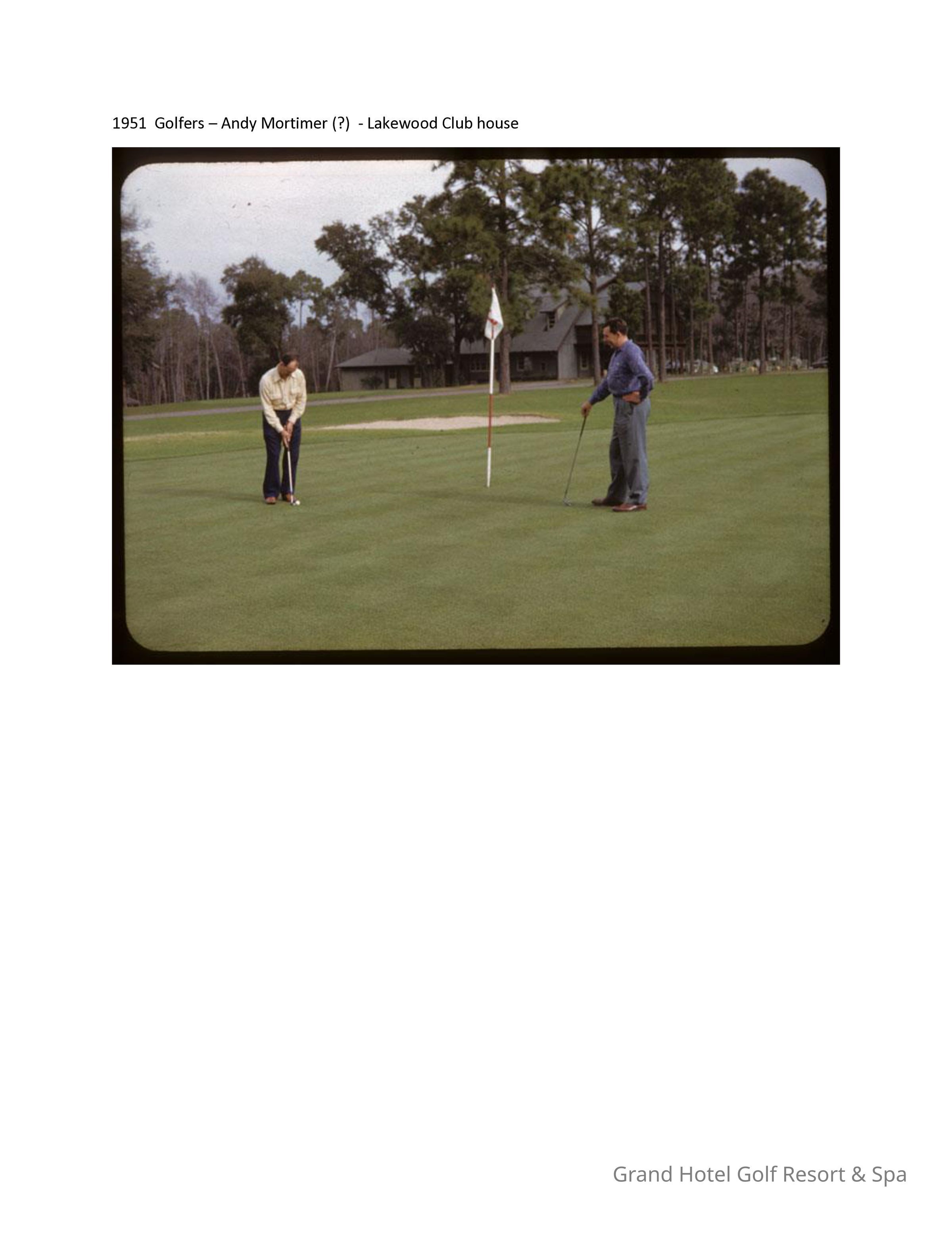 Golfers on 18th green in front of Lakewood Golf Club, most likely Andy Mortimer, golf professional circa 1951