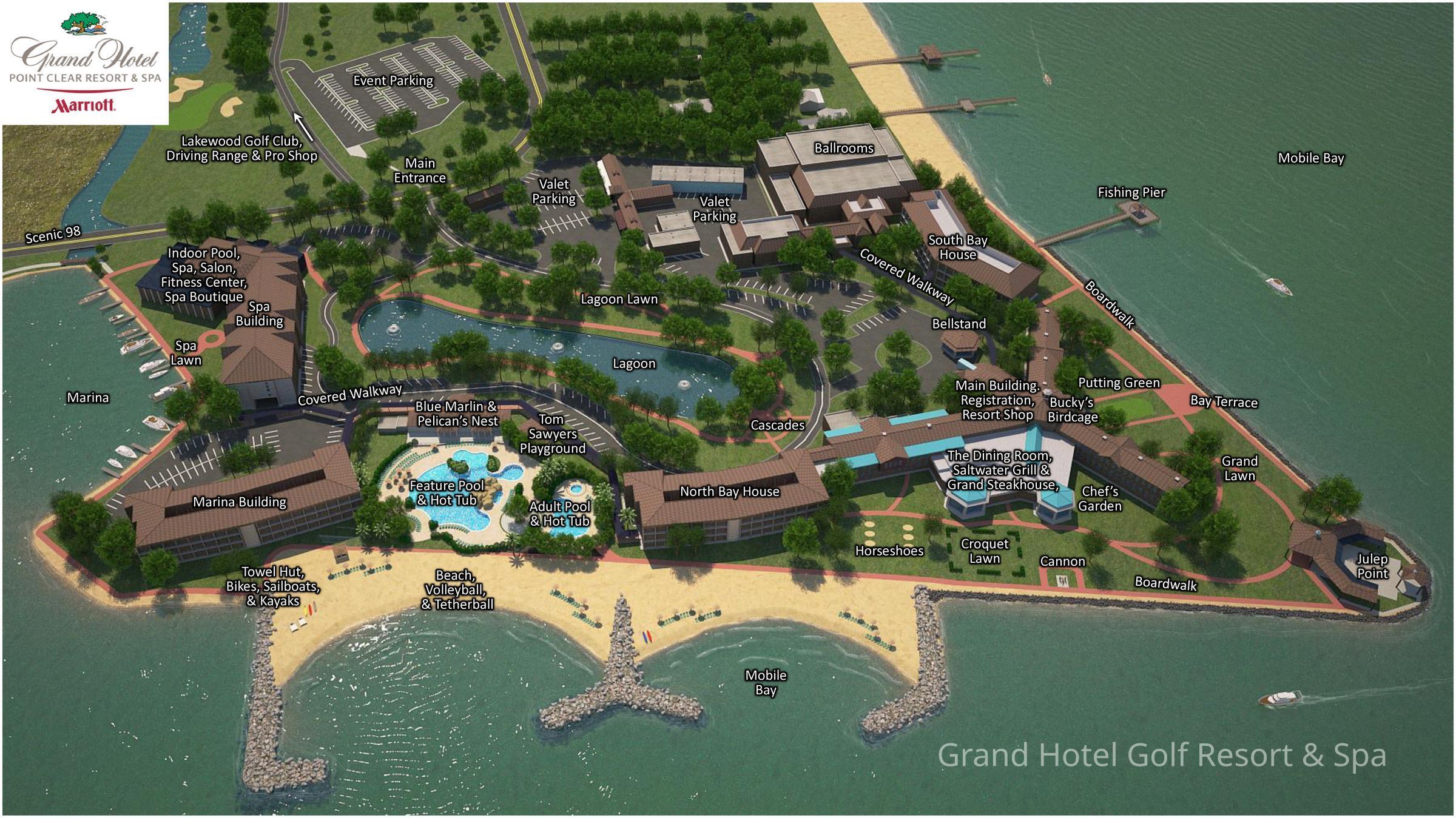 Part of the check-in piece is the site map, helping guide guests to the destination on property. The Great Point Clear is the the location of the Julep Point pavilion. The Conference Center is adjacent to the property line to the east of South Bayhouse. The Spa Building overlooks the Grand Hotel Marina yacht basin. Grand Feature Pool complex overlooks the man-made beach front, on the western side of the resort.Create Date
