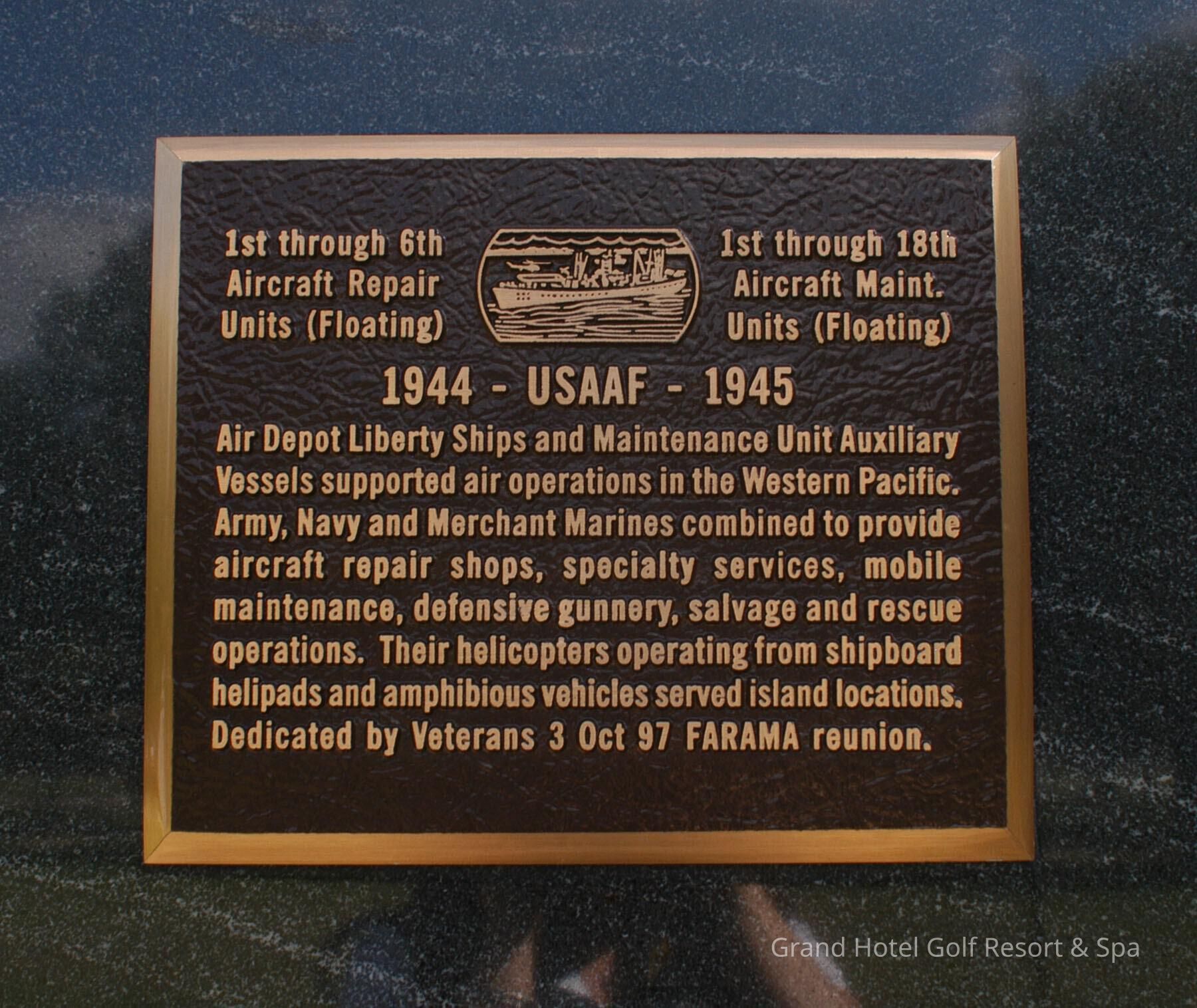 This plaque honors the crews of WWII "Operation Ivory Soap" Air Depot Liberty Ships and Maintenance Unit Auxiliary Vessels 1944 USAAF 1945 - dedicated 3 October 1997, at a veterans of FARAMA reunion in Dayton, Ohio.Create Date