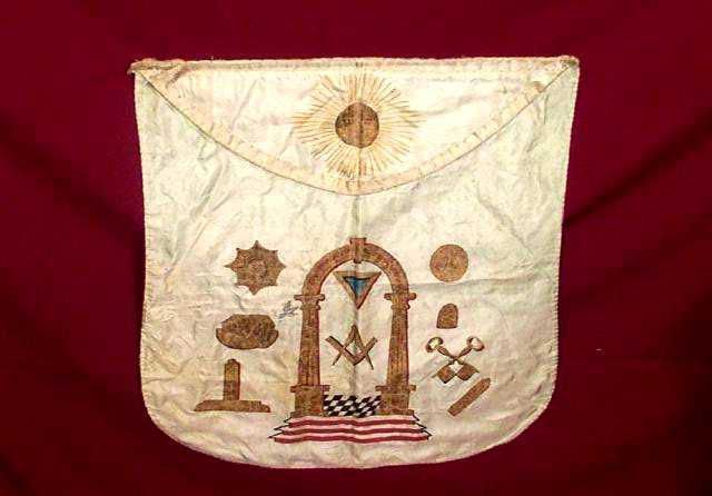 Apron: Blue green apron with Masonic emblems painted in gold, sun on flap. Belonged to Robert McMannus, United Lodge, Brunswick, Maine. Dated November, 1823Entry/Object ID