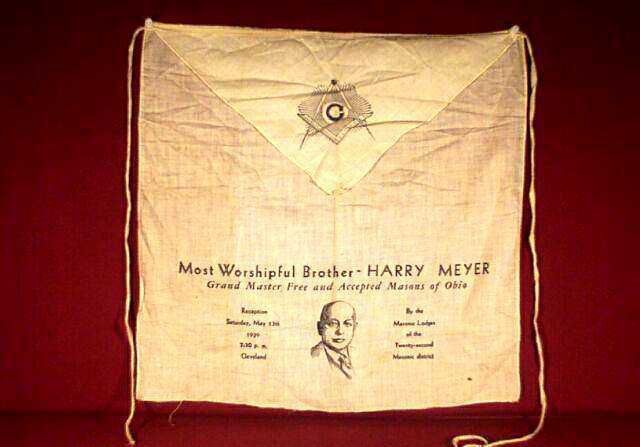 Apron: CLoth apron for the reception of M.W.B. Harry Meyer, 22nd District, dated May 13, 1939. ith picture of Harry Meyer on body.Entry/Object ID