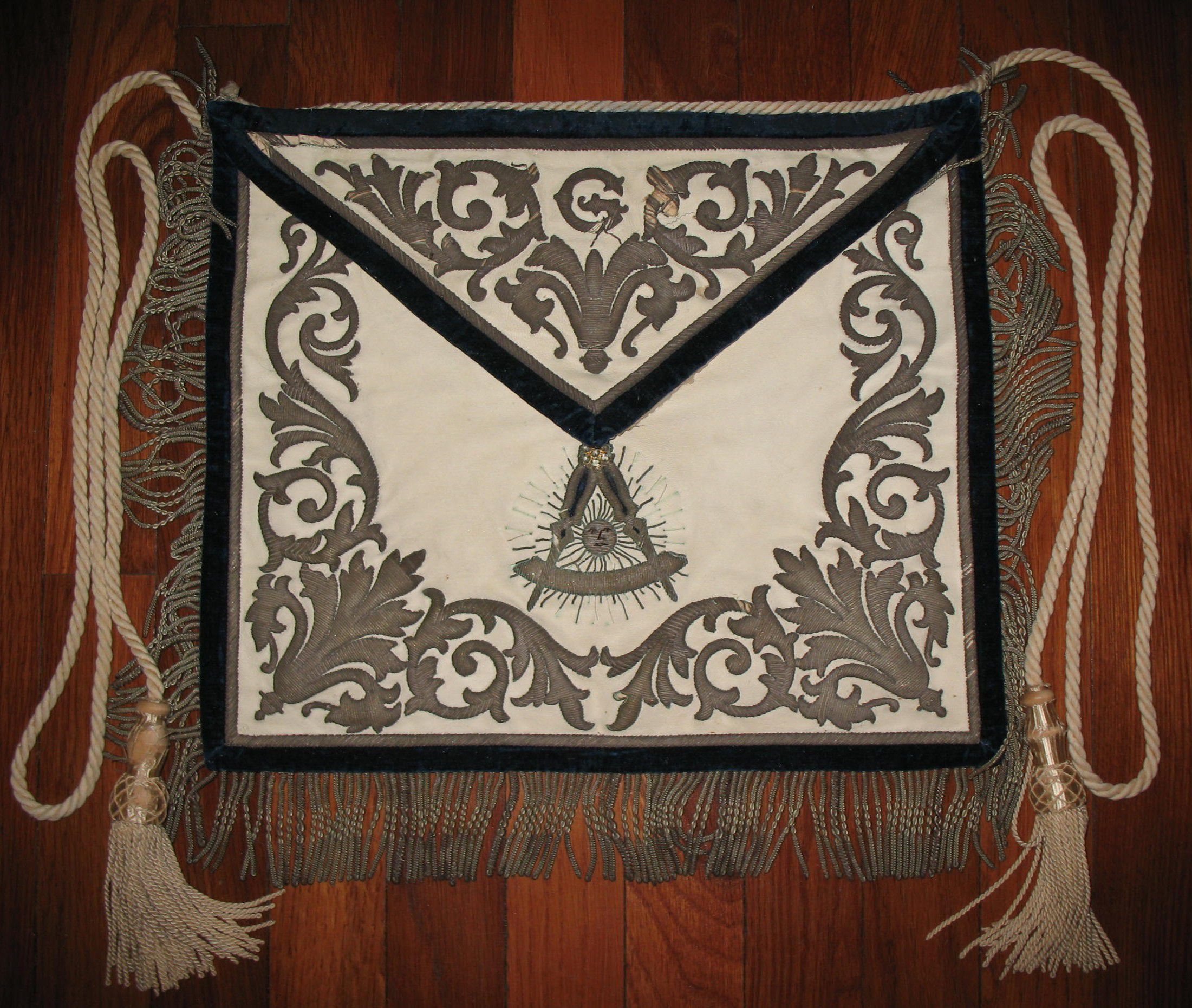 Apron: District Lecturers apron. White leather, brocade Past Master's emblem and other designs. Blue velvet border, tassels same color brocade. White cord. Under flap: "Presented by the 24th District to Bro. John W. Moore District Lecturer". Additional information in Source Binder.Collection
