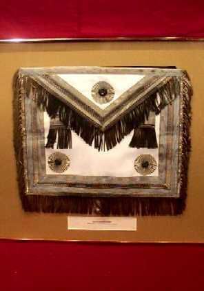 Apron: Irish Masonic apron presented to Ernest Chatterfield of Akron, Ohio. Framed. 15" x 12 1/2" sky blue, white lambskin, silver tassels, blue rosettesCollection