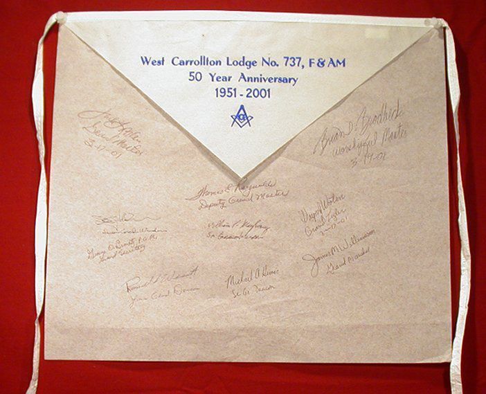 Apron: Paper apron 50th anniversary of West Carrollton Lodge #737, dated 1951-2001. White paper apron signed by Grand Lodge Officers and the Worshipful Master of West Carrollton Lodge.Collection