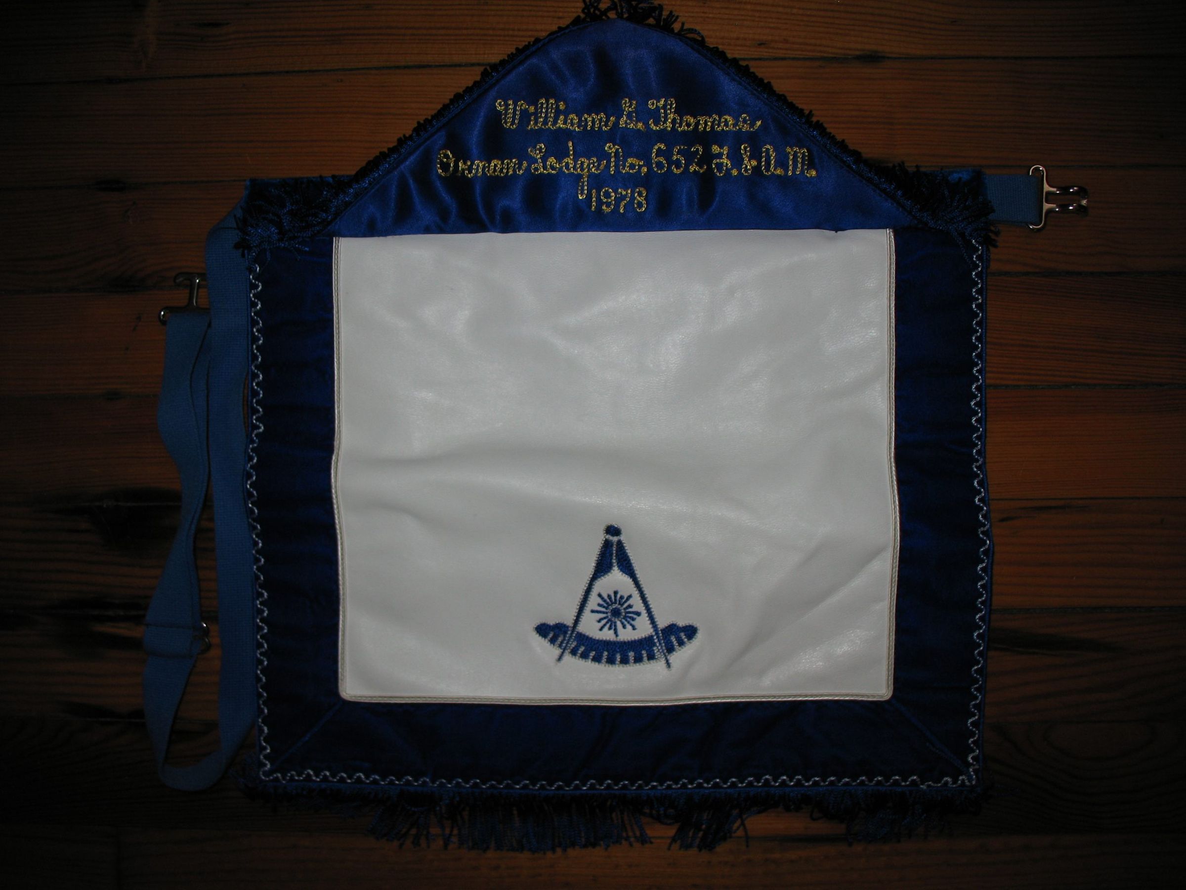Apron: Past Masters Apron, machine embroidered: Past Masters emblem - on flap, Ornan, P.M. - under flap, William G. Thomas Ornan Lodge No 652, 1978. 15" x 13" White with blue velvet border and 1 1/2" fringe on the bottom of flap and bottom of body.Collection