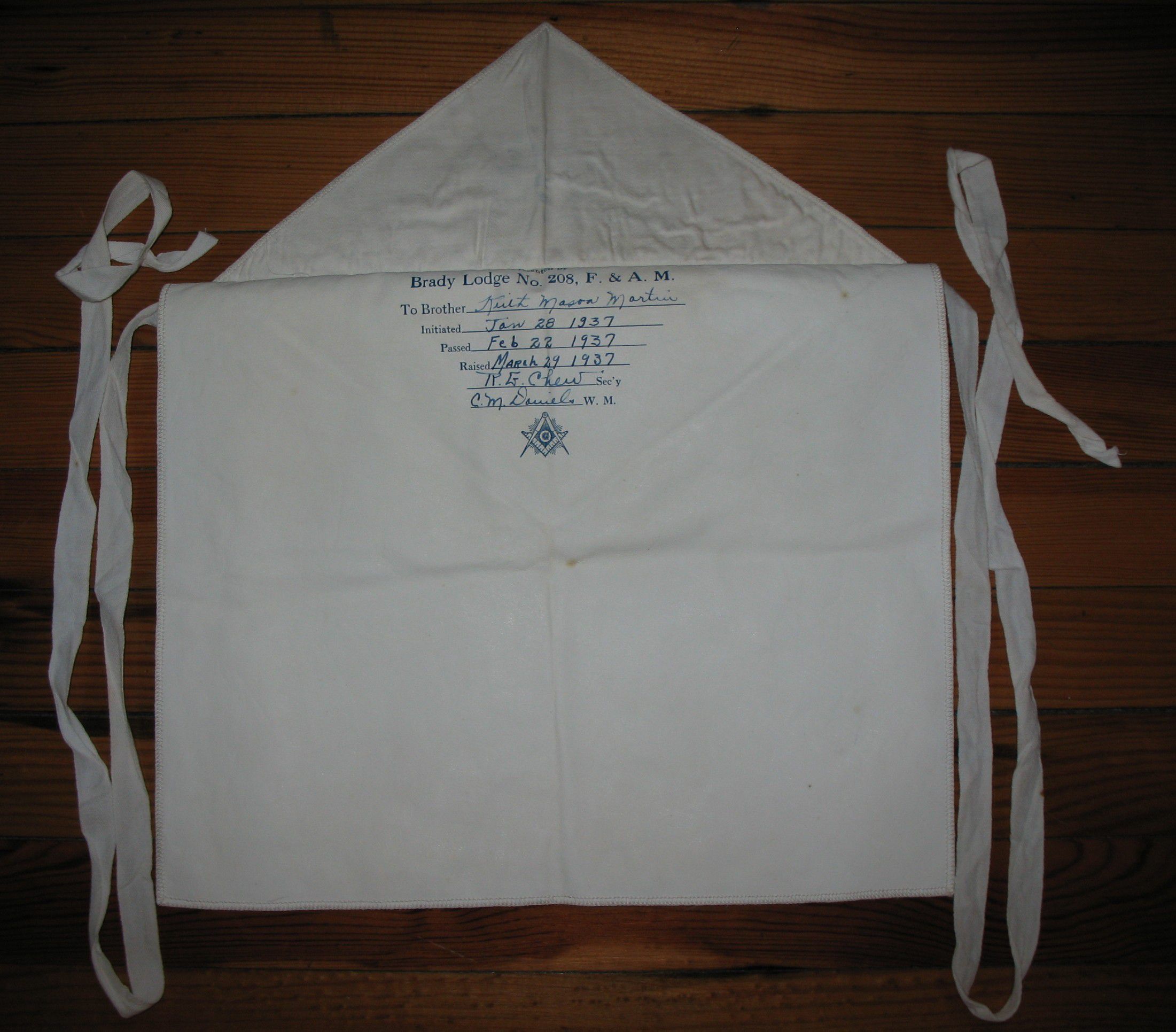 Apron: Printed under flap: "Presented by Brady Lodge No. 208 F&AM to Brother Keith Mason Martin. Initiation: E.A. Jan 28, 1937, F.C. Feb 22, 1937, M.M March 29, 1937". White leather candidates apron, cotton tape tiesEntry/Object ID
