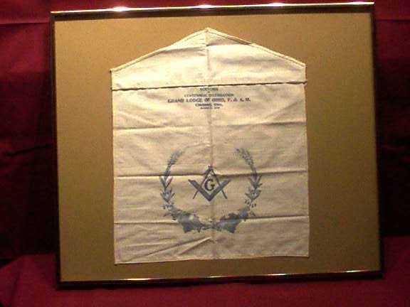 Apron: White cotton, blue printing. 13 1/2" x 13" with Square & Compasses on body and All Seeing Eye on flap. Souvenir of Centennial Celebration, Grand Lodge of Ohio, October 21, 1908Entry/Object ID