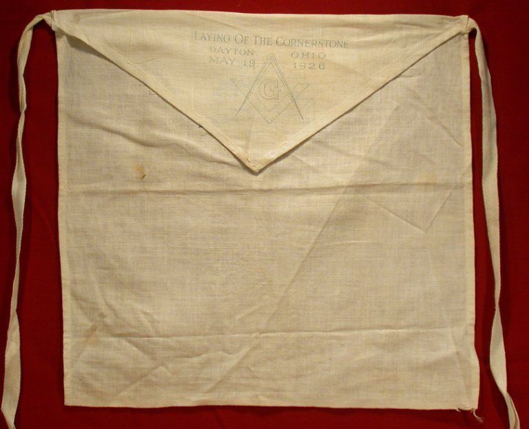 apron: White cotton with blue printing. Laying of corner stone, Dayton, Ohio, May 19, 1926 with Square & Compasses on flap. 12 1/2" x 13 1/2"Entry/Object ID