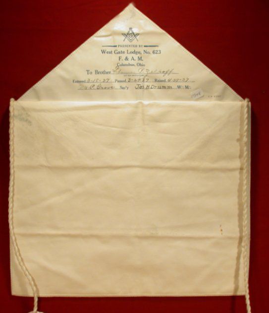 Apron: White lambskin. 13" x 15". Presented by Westgate Lodge #623 F. & A. M. To: Bro Thomas P. Zelpoff, EA 3/15/37 FC 3/29/37 MM 4/29/37Entry/Object ID