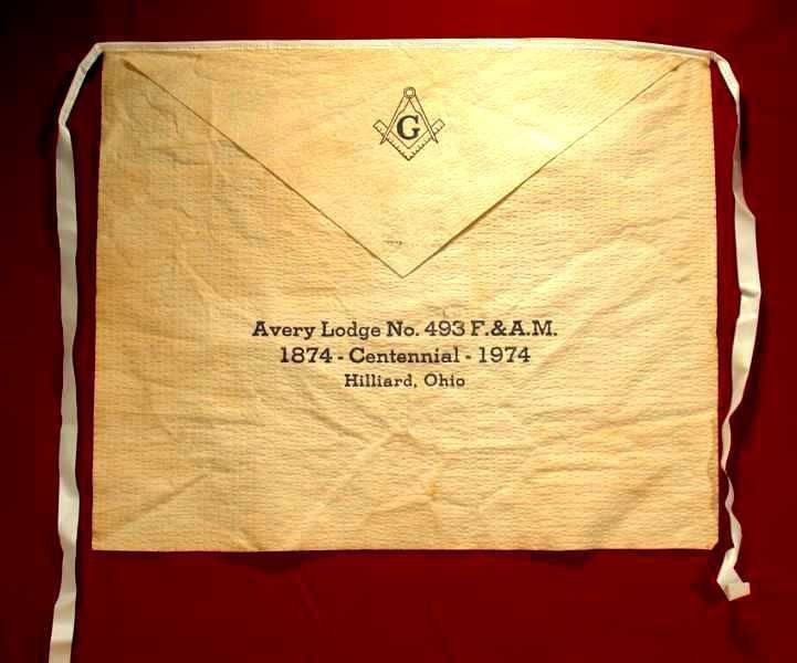 Apron: White paper with blue print. 12" x 15". Avery Lodge #493, 1874 - Centennial - 1974, Hilliard OhioEntry/Object ID