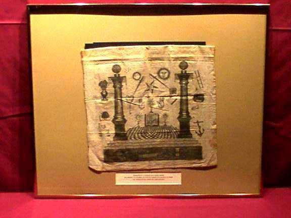 Apron: White print silk apron with Masonic emblems on front and flap. 15" x 12 1/2". Worn by Calmes Lafayette VoightCollection