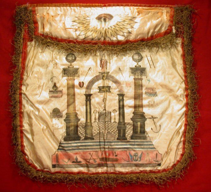 Apron - White silk, red and gold fringe and lining belonging to David Hunter, a member of Blair-Dairy Lodge #290, Scotland, 1868. 15 1/2" x 16 1/2" decorated front, All Seeing Eye on FlapEntry/Object ID