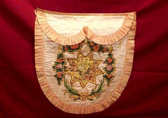 Apron: Wite cloth with pink border. Apron framed. 17" longEntry/Object ID