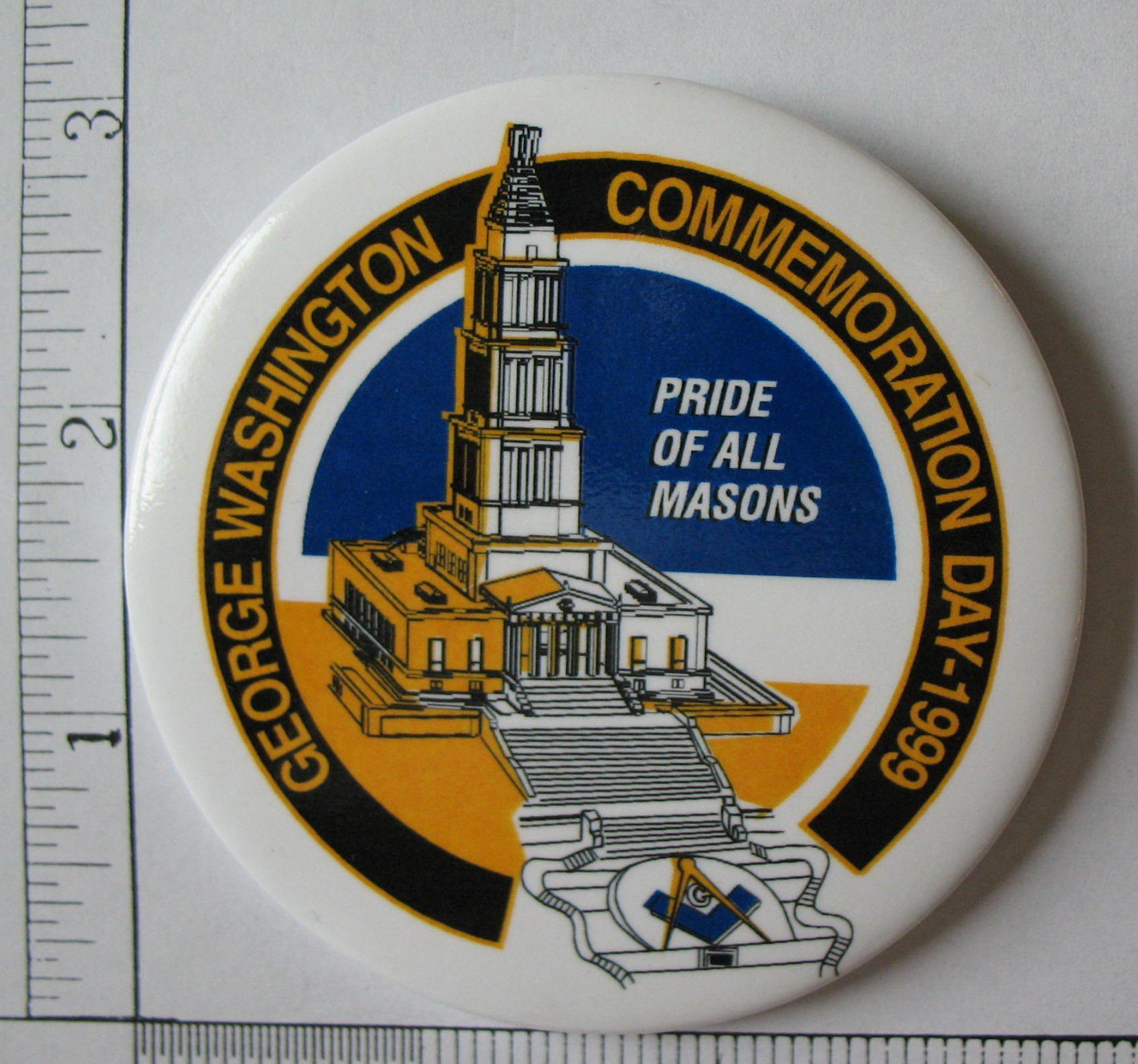 Badge: "George Washington Commemoration Day 1999" and "Pride of All Masons". Depicted on teh badge is the George Washington Masonic National Memorial. 3" diam.Entry/Object ID