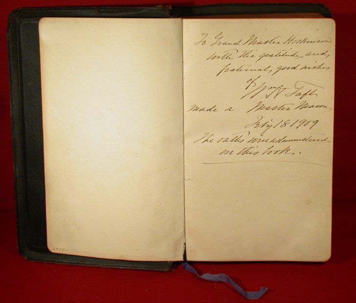 Book: BIble, the Oxford Self-Pronouncing Bible dated 1901. The bible on which William H. Taft took the obligation. Book mark 5/16" dark blue ribbon, page 1121. Size 6 1/2" x 8 1/2". Black cover signed by William H. Taft (second white page)Collection