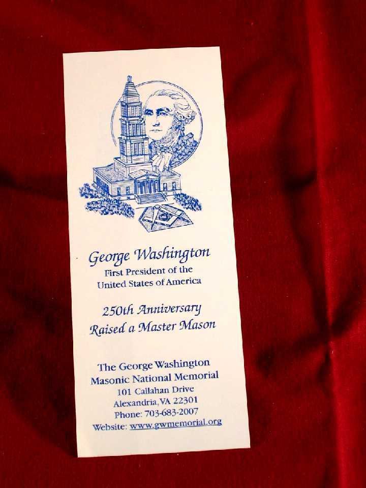 Bookmark: Celebrating the 250th Anniversary of the raising of George Washington,a Master Mason. White paper with blue lettering.Entry/Object ID