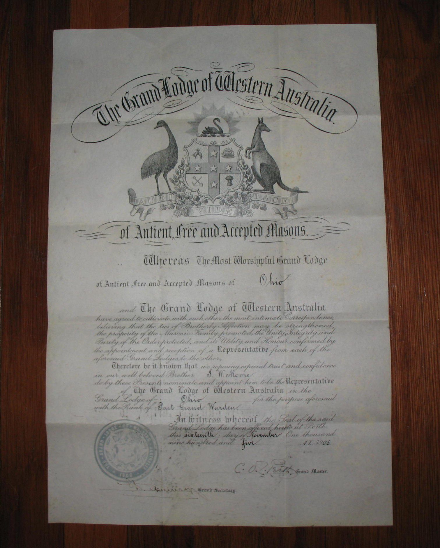 Certificate: Document establishing I. W. Moore Representative of the Grand Lodge of Western Australia to the Grand Lodge of Ohio. November 16, 1905. Strong cream colored paper or it could be vellum or maybe drafting linen? 20 3/4" x 16 3/4". Additional information in Source BinderCollection