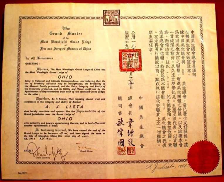 Certificate: Presented to A. J. Lista from the Grand Lodge of China, dated March 30, 1954Collection