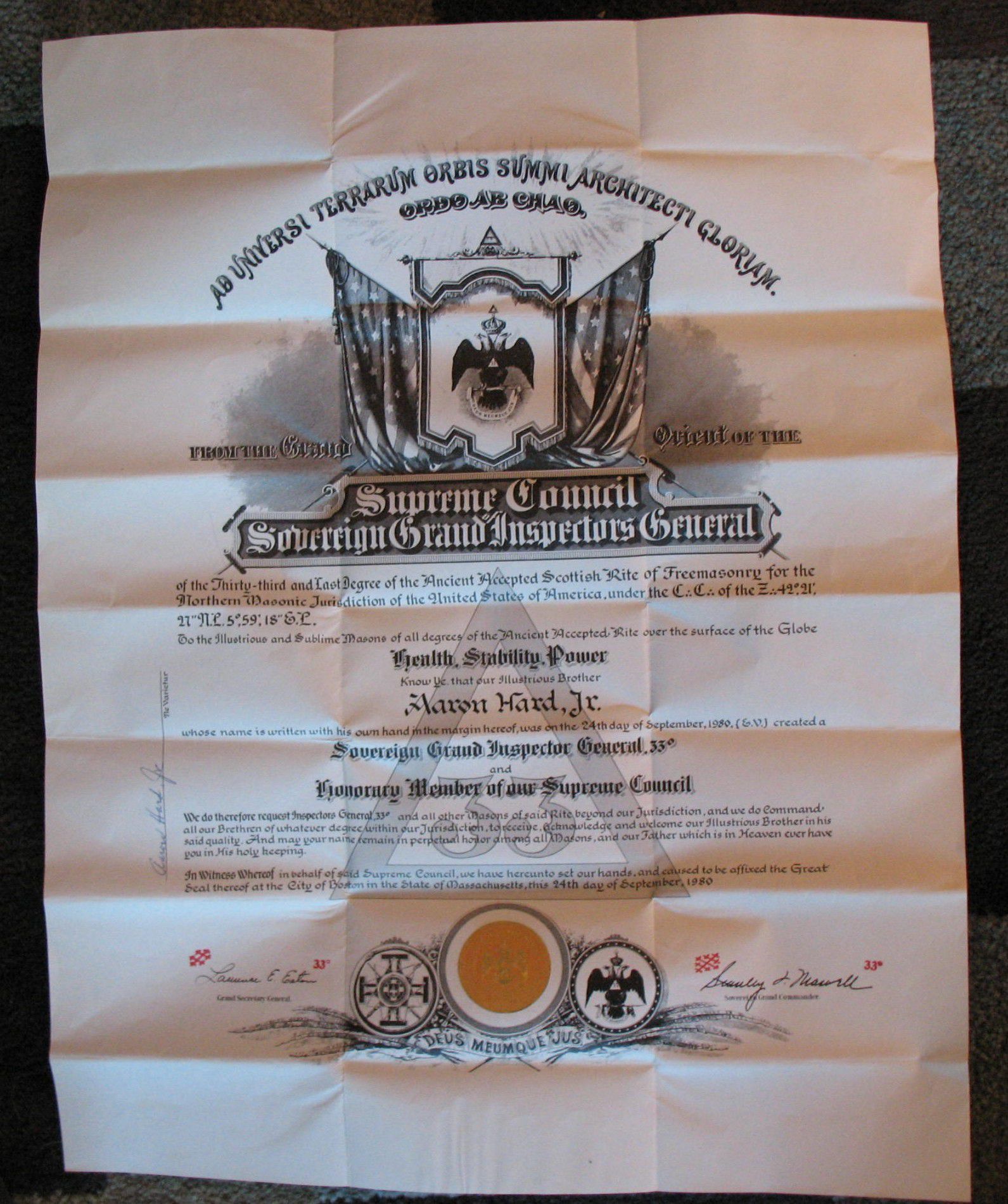 Certificate: Supreme Council certificater honoring Aaron Hard Jr. as an Honorary member. 20 1/2" x 16". Certificate is in a black simulated leather pouch. On the pouch printed in gold "Supreme Council 33 Degree A.A.S.R. Northern Masonic Jurisdiction U.S.A."Collection