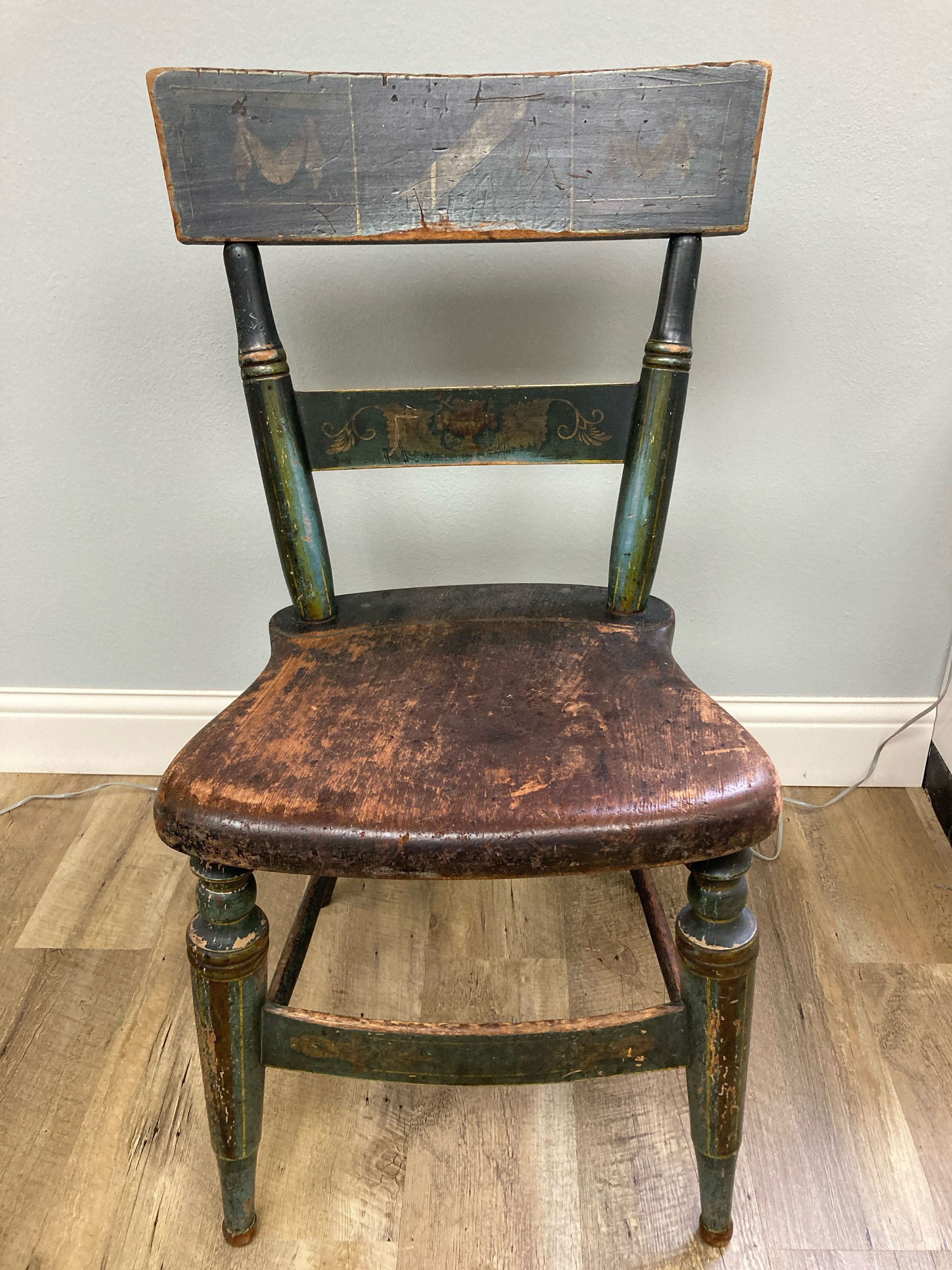 Wooden chair, painted, decorated with a painted plumb or plumbline on the back, emblem of the Junior Warden, along with other ornamental decorations.Collection
