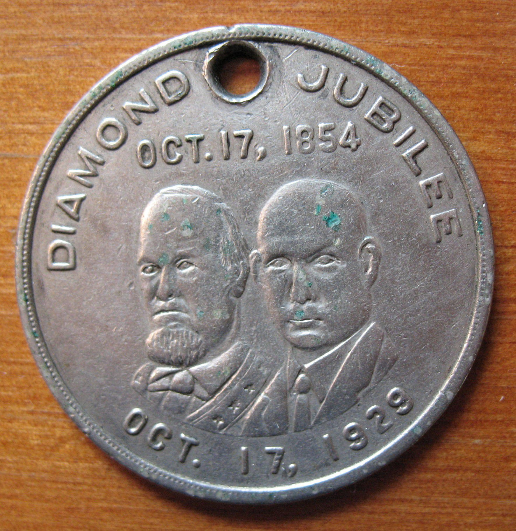 Coin, Commemorative: Stuck by Bigelow Lodge No. 243, Cleveland, Ohio, (1854 to 1994) for their Diamond Jubilee. 1 3/8" diameter medallion with a hole in it could be worn as a charm.Collection