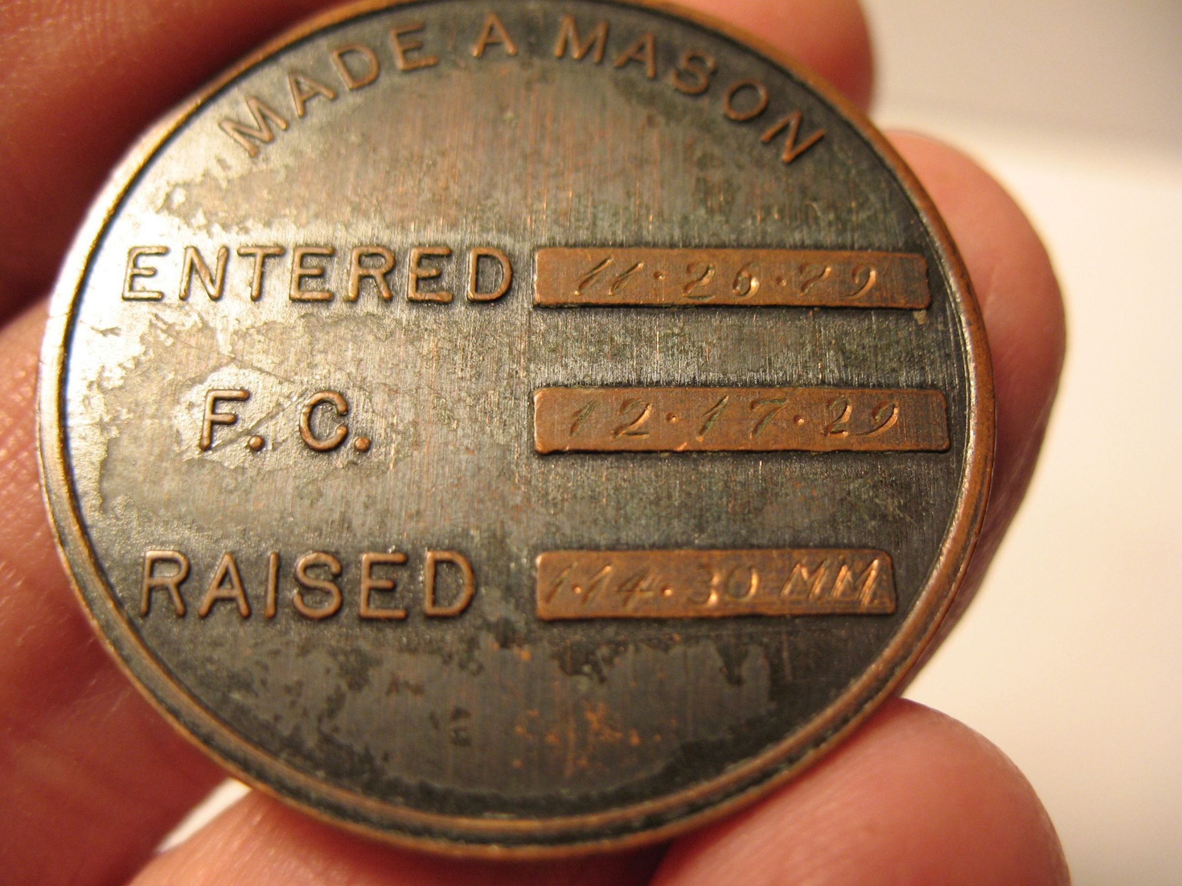 Coin: Copper pocket coin. On one side emblems of Masonry. On the other side the dates that Evan David Jones Jr. was made a Mason (engraved): Entered 11/25/29, F.C. 12/17/29, Raided 1/14/30 M.M. We also have his apron CN 2094. 1 1/4" diam.Entry/Object ID