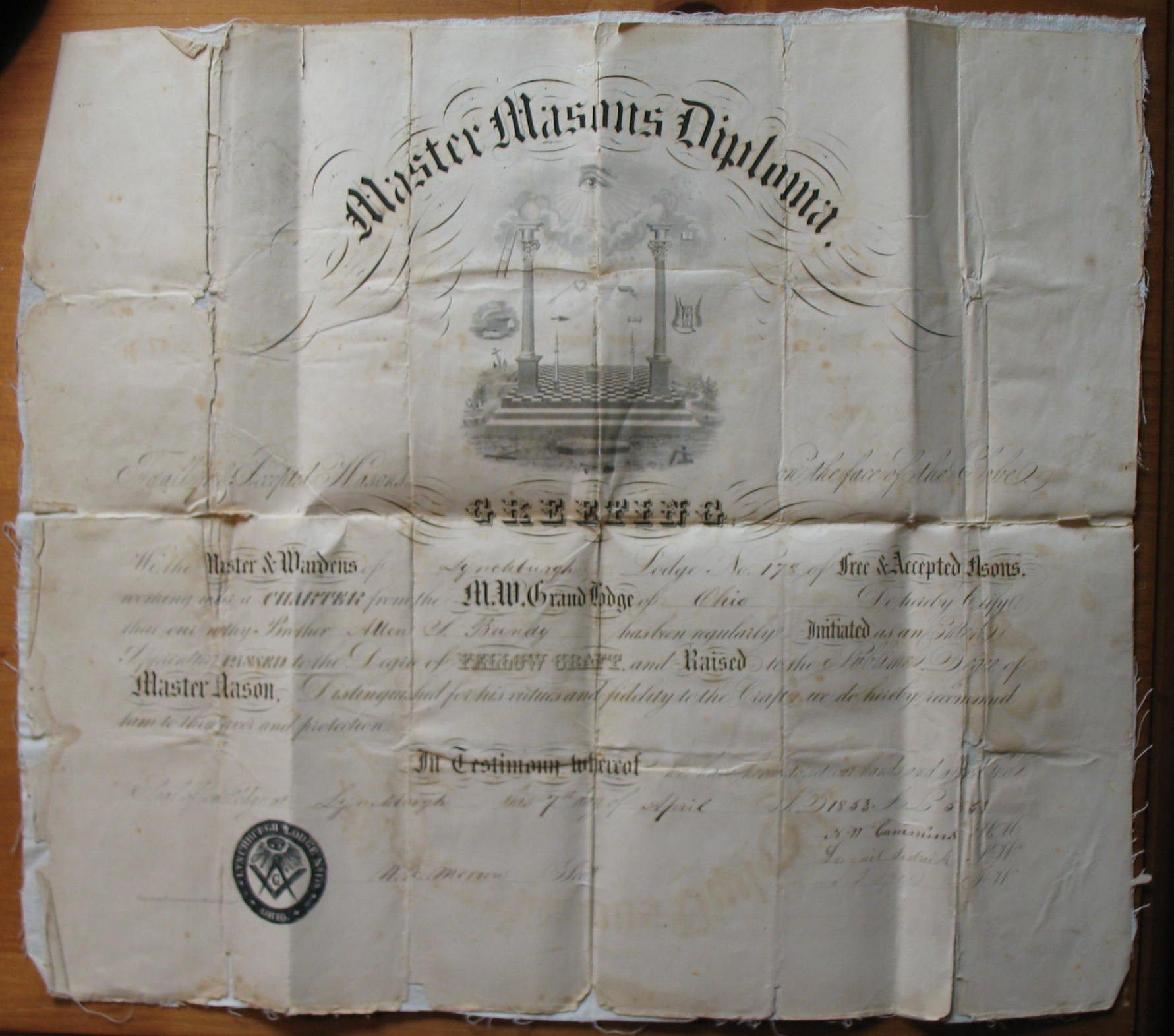 Diploma: Issued to Bro. Allen S. Bundy from Lynchburg Lodge No. 178, April 7th, 1853. The diploma has been glued to a piece of fabric. 16" x 18"Collection