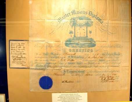 Diploma: Master Mason diploma issued to R. A. Fulton, Septeber 16, 1861. 15 1/4" x 16 2/4" paper is parchment type and folds into a book. Has Amesville sealCollection
