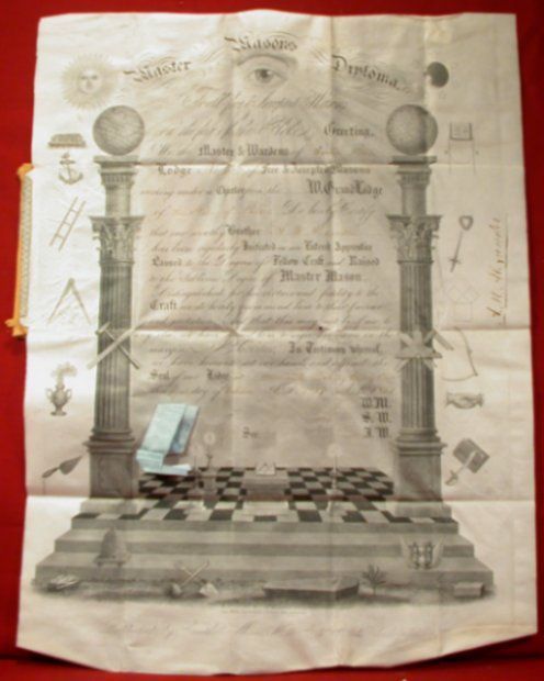 Diploma: Traveling diploma from Center Star Lodge #11, Granville, Ohio for A. M. Alexander, dated October, 1857. It is ornately decorated with various Masonic symbols. Red leather cover folds to 3 1/2" x 5"Entry/Object ID