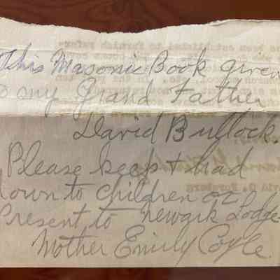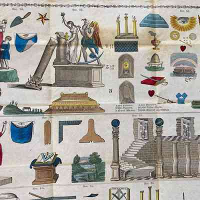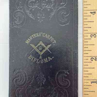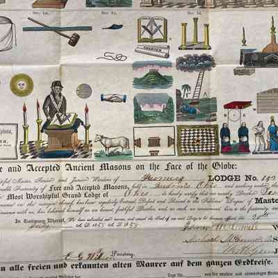 Membership diploma issued by Farmers Lodge 153 in 1858 to David Bullock, Master Mason. Diploma folds into pocket-sized booklet. This diploma is illustrated with symbols from the Master's Carpet. Copyrighted 1852 by John Sherer, Cincinnati, Ohio.Collection