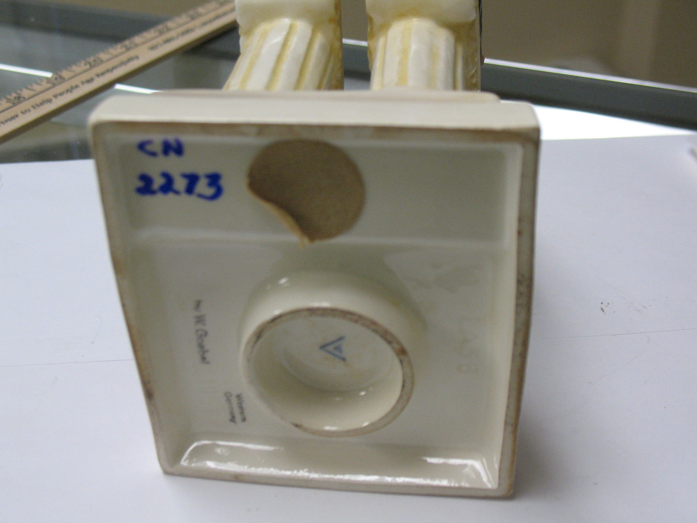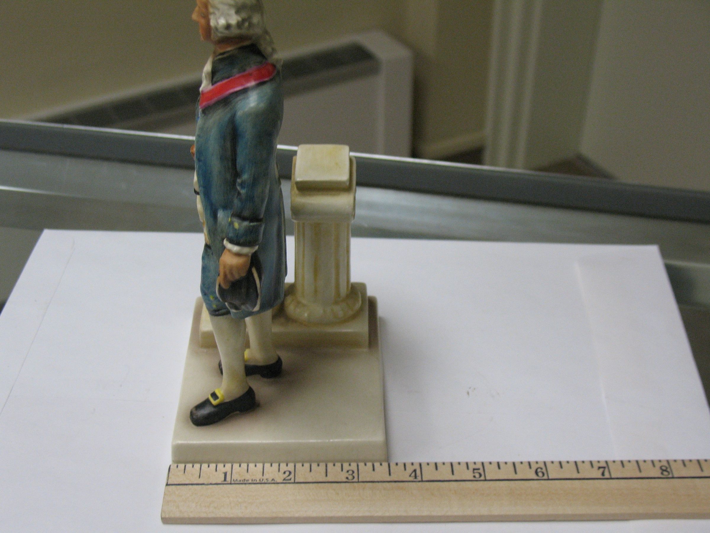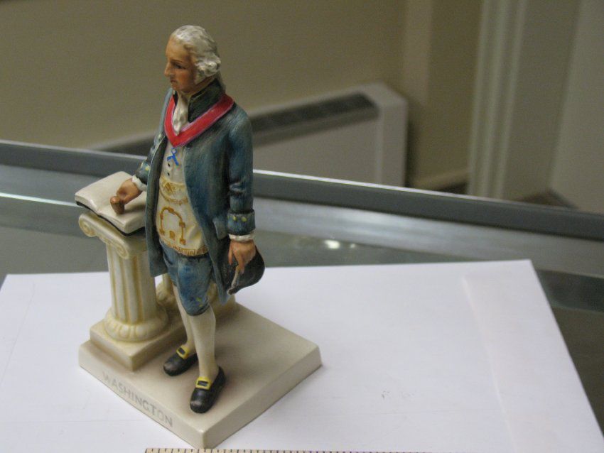 Figurine: Painted ceramic figurine of George Washington wearing a Masonic apron and Master's Jewel holding a gavel. Blue coat and black shoes. Stamped hv W. Goevel, Western GermanyEntry/Object ID