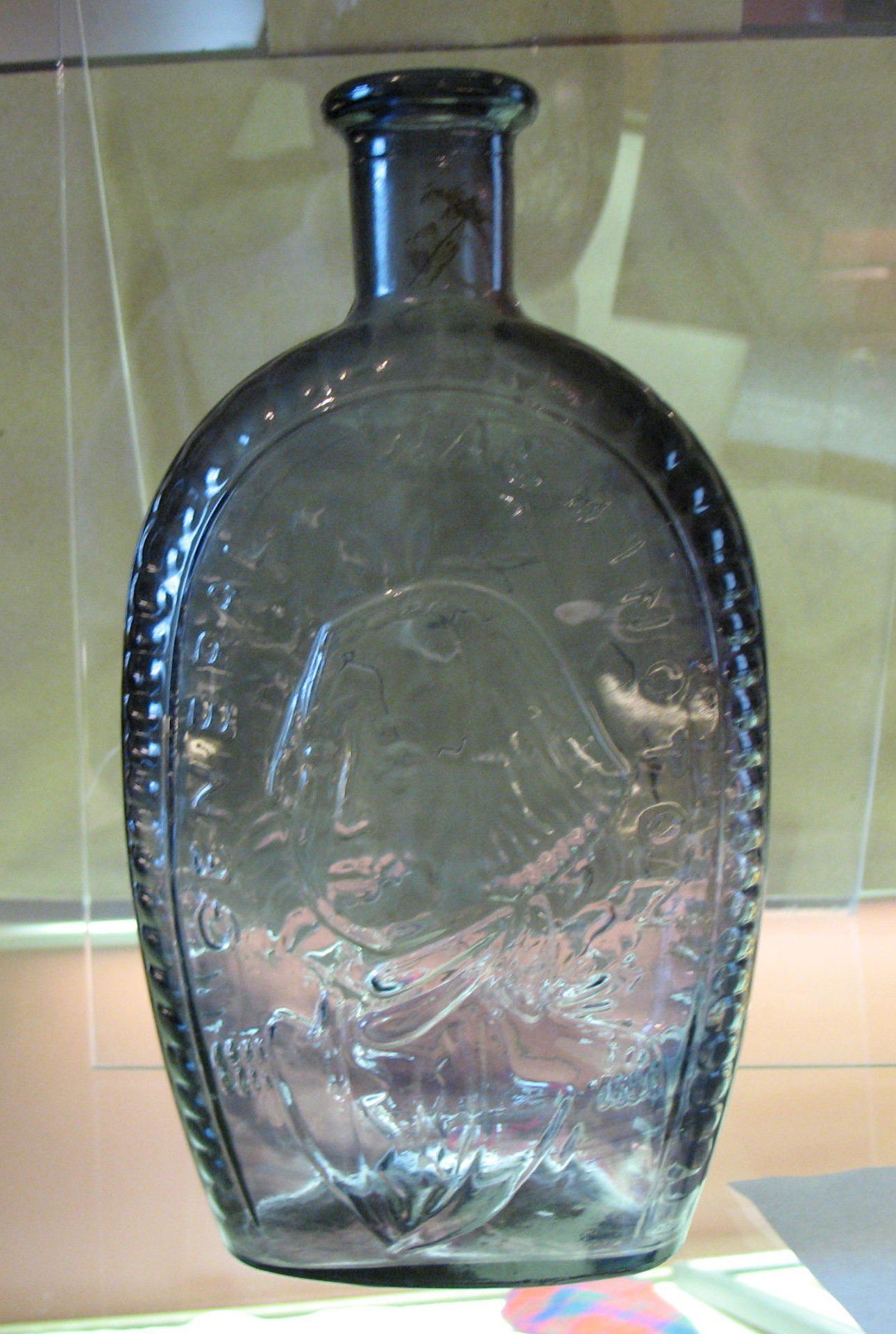 Flask: George Washington glask. The image of General Washington on one side and the American Eagle on the other. Purple glass, 8 3/4" high.Entry/Object ID