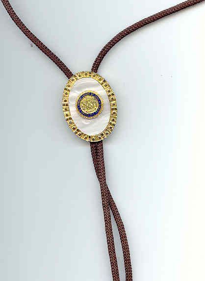 Jewelry: Bolo tie with 50 year pin. Gold color with white center and brown cordCollection