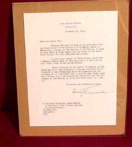 Letter: From President Harry Truman to the Most Worshipful Grand Master of F & A. M. of Ohio, 319 East 5th St., Cincinnati, Ohio, dated November 22, 1952. RE: stone taken from the White House during the remodeling in 1952 making reference to the Masonic marking found on it.Collection