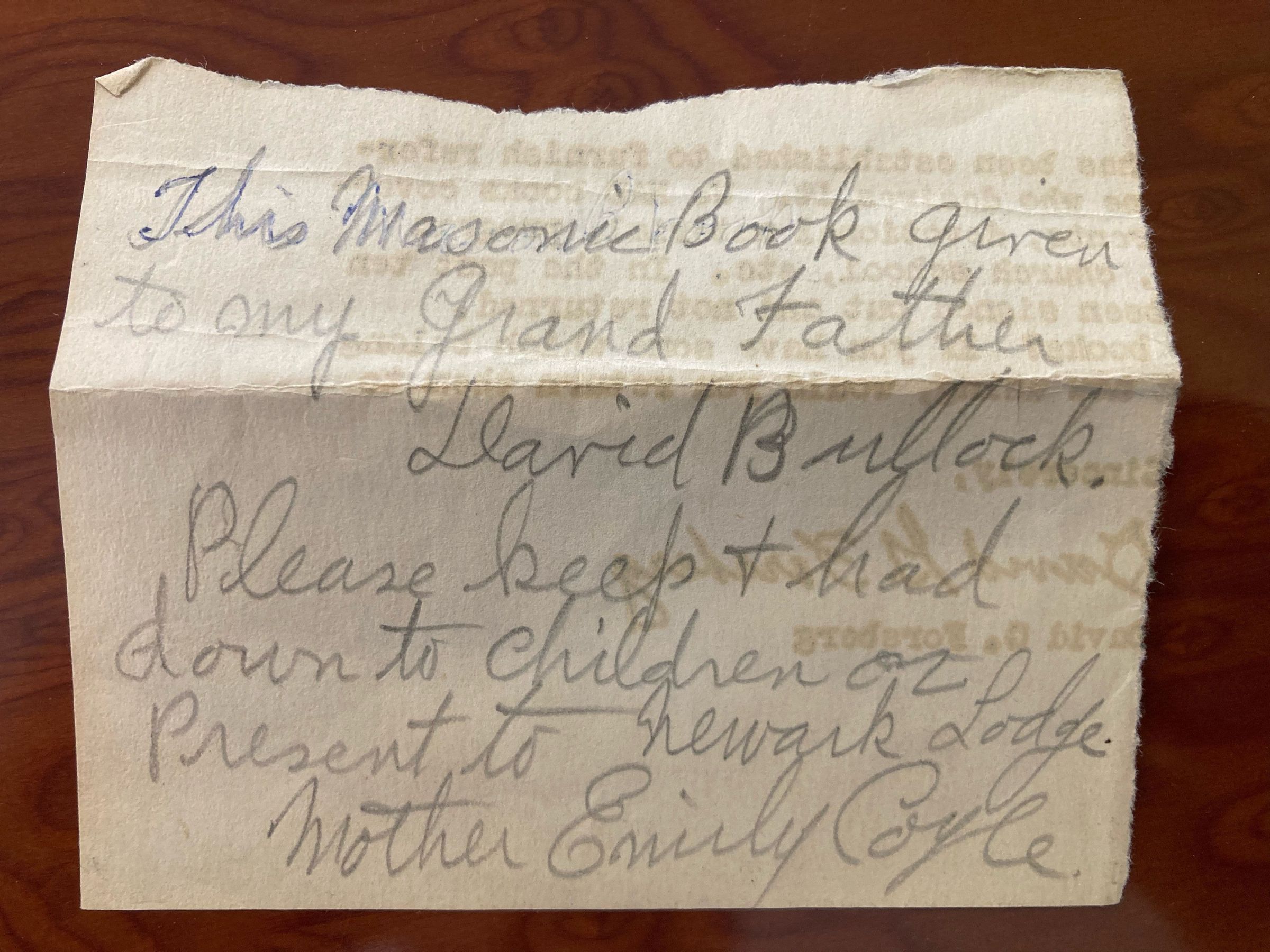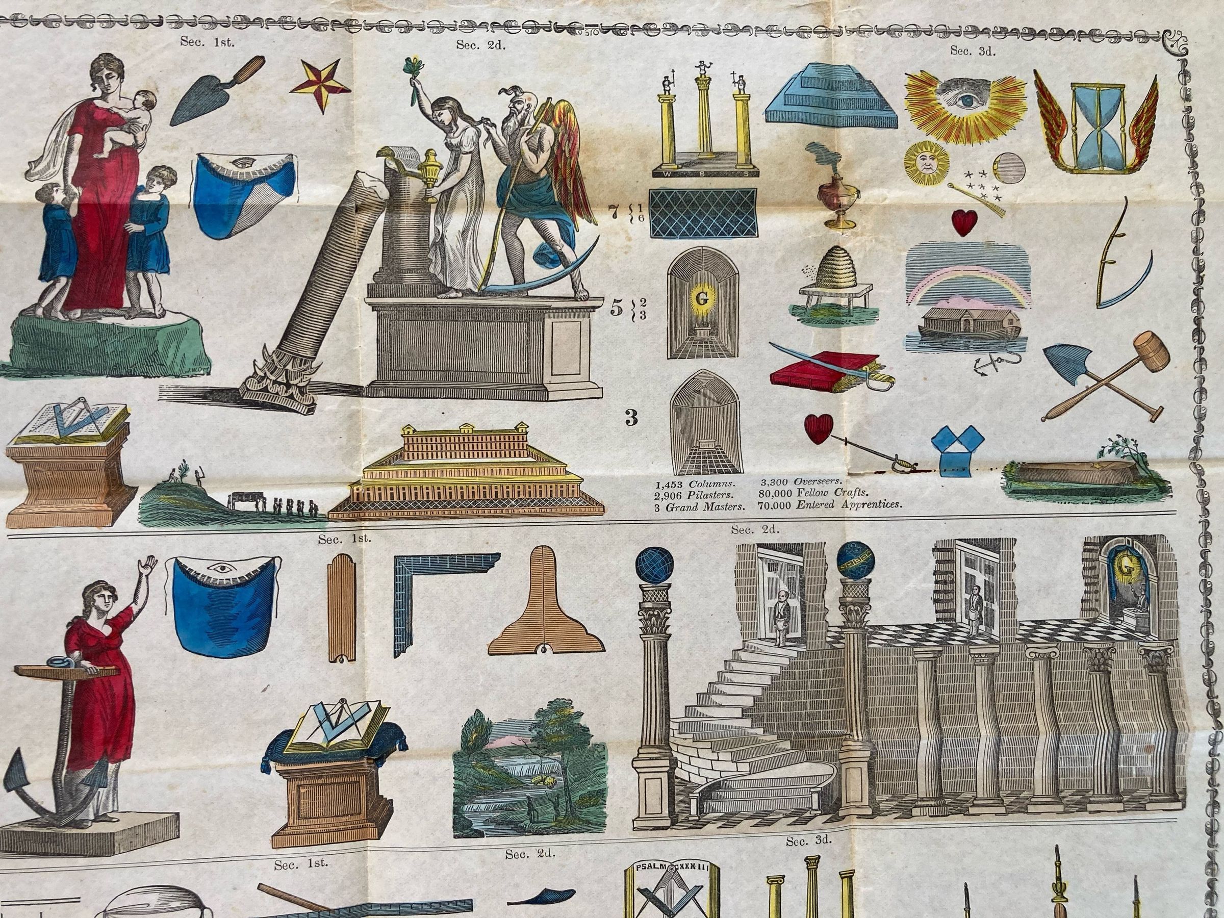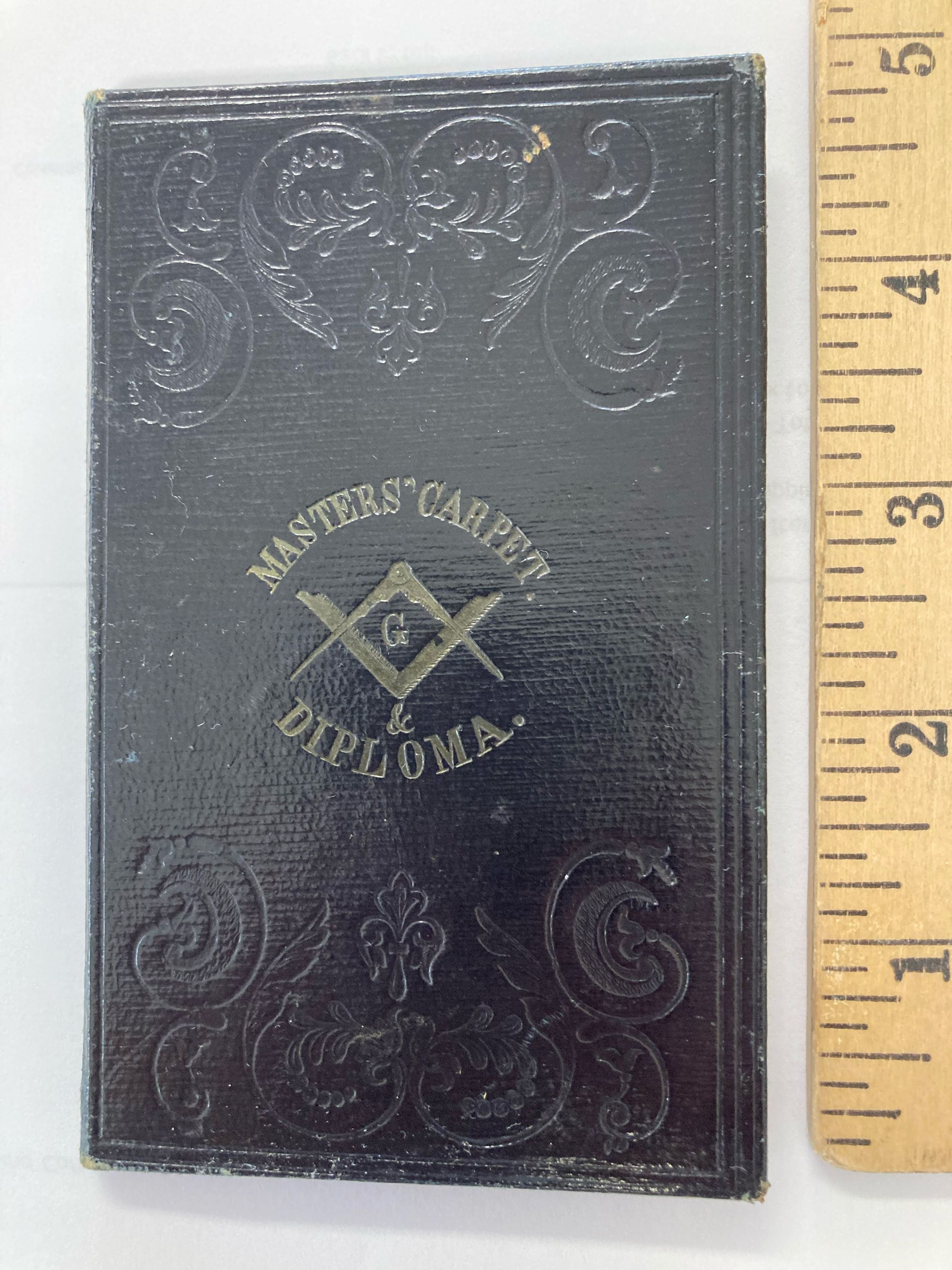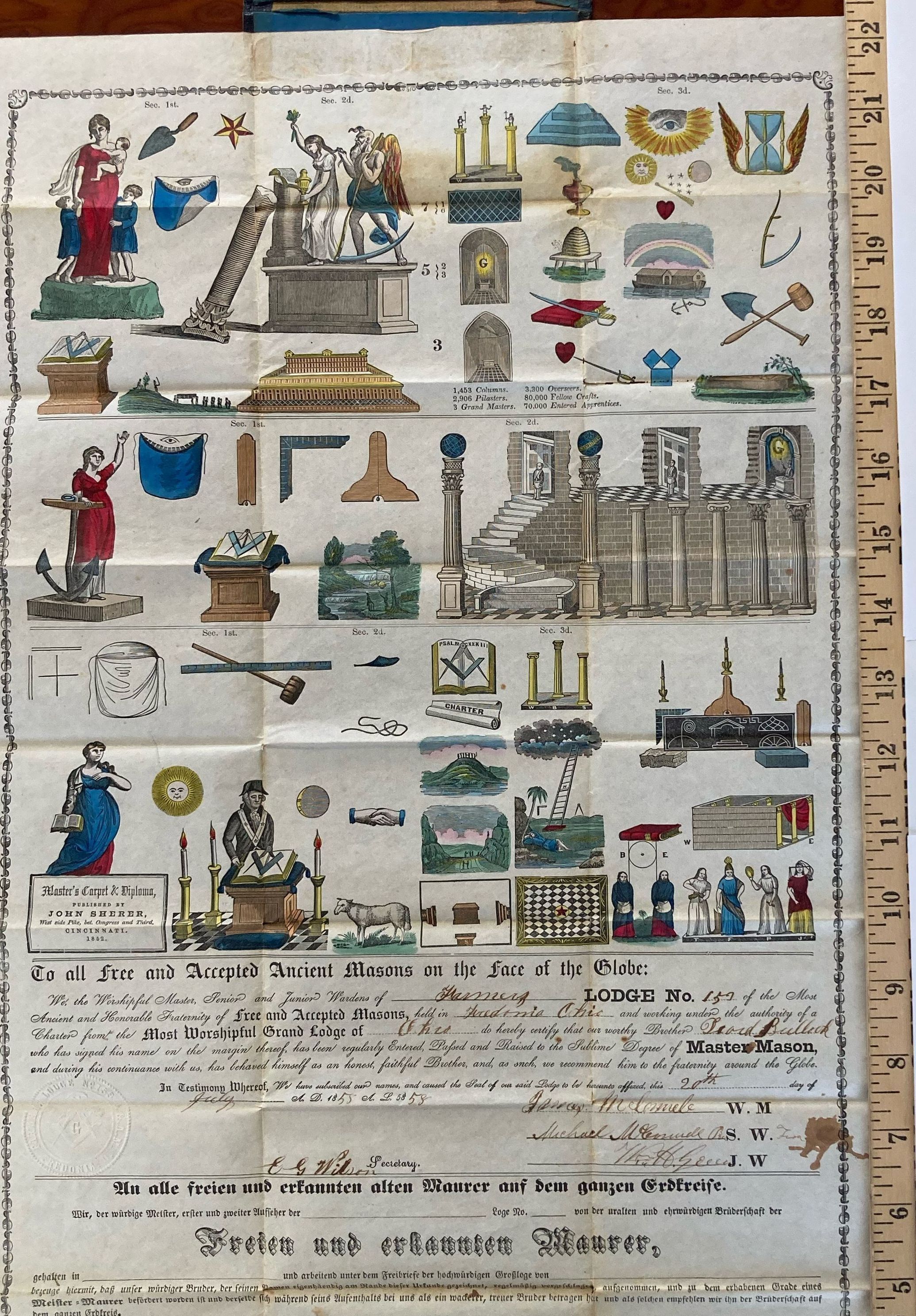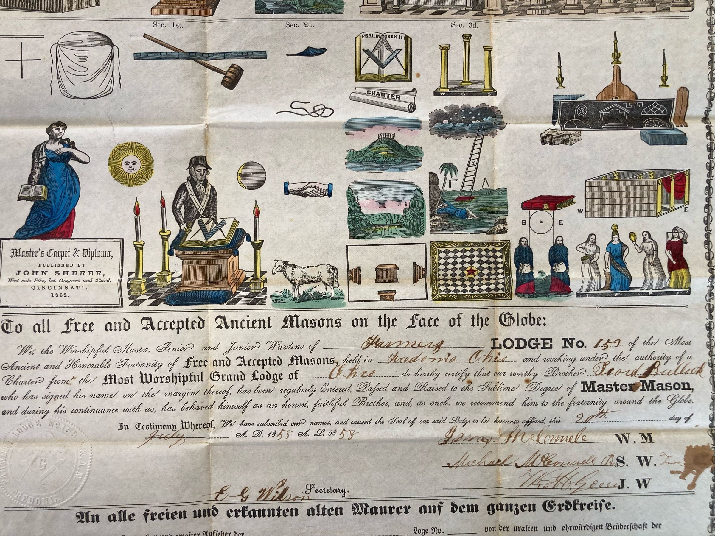 Membership diploma issued by Farmers Lodge 153 in 1858 to David Bullock, Master Mason. Diploma folds into pocket-sized booklet. This diploma is illustrated with symbols from the Master's Carpet. Copyrighted 1852 by John Sherer, Cincinnati, Ohio.Collection