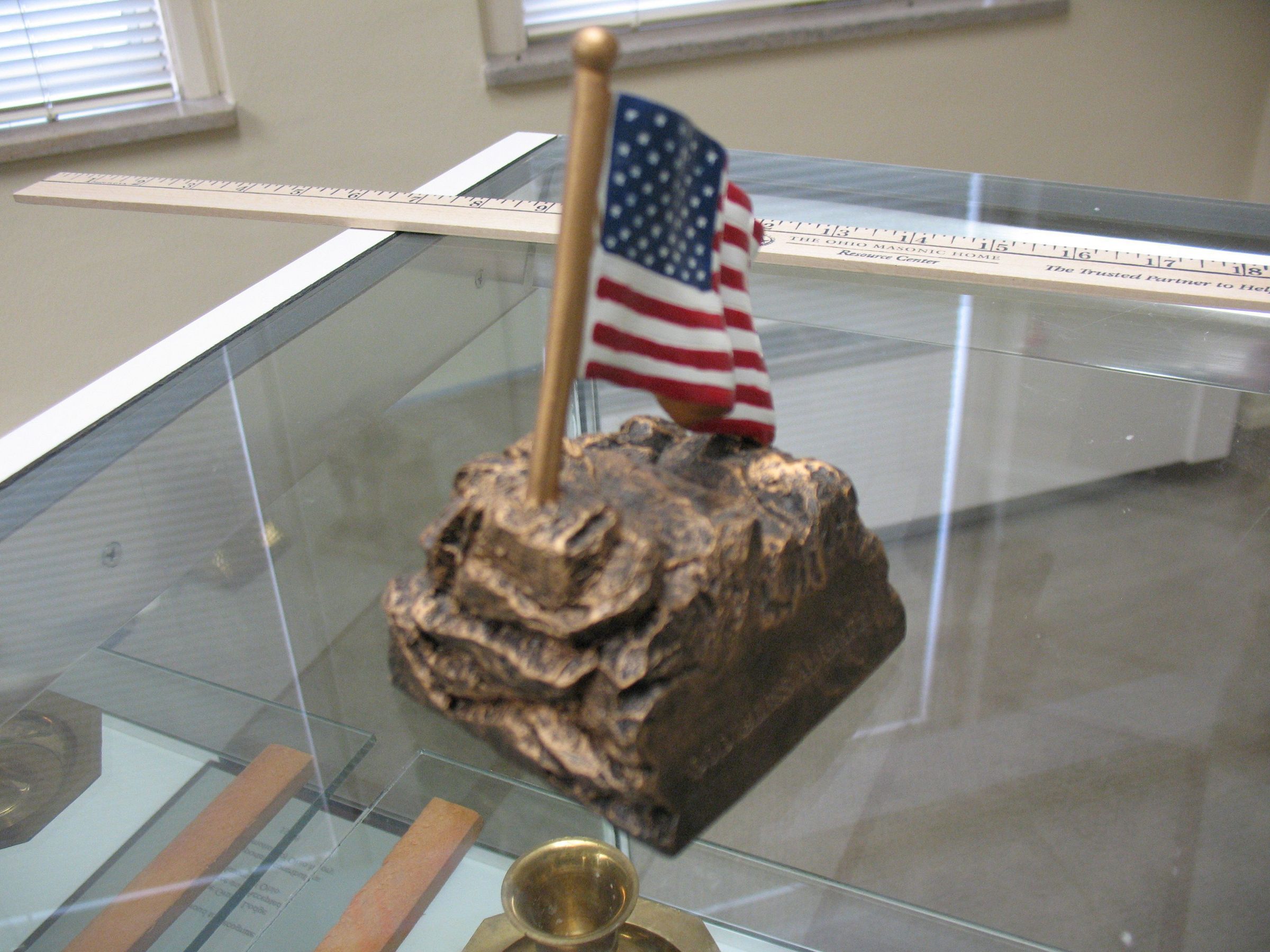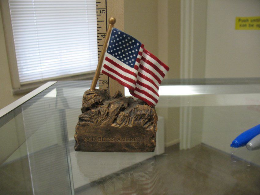 Paperweight: Bronze collored rack with waving American flag. God Bless American engraved on front.Entry/Object ID