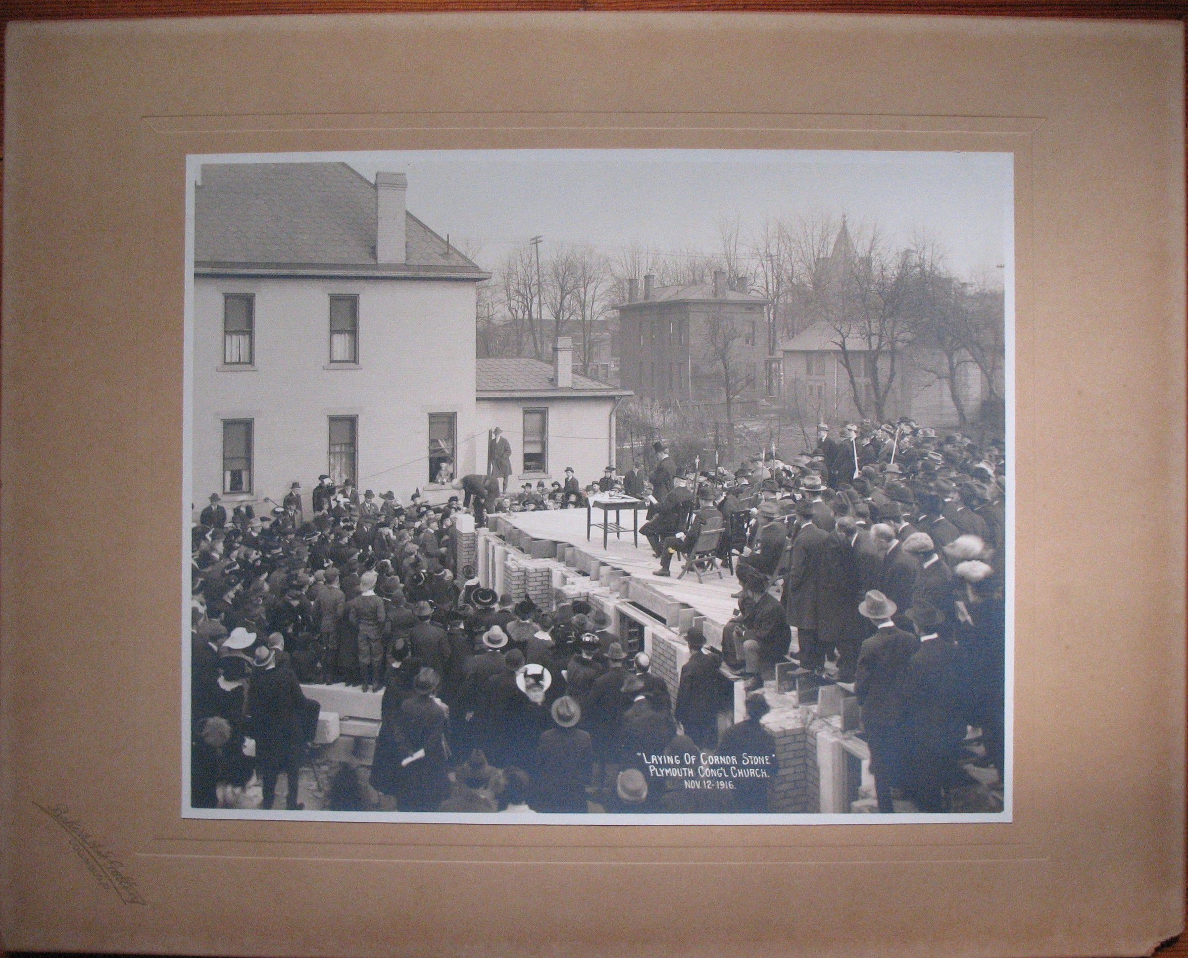 Photograph: Black and white photo of a cornerstone laying. 9 5/8" x 7 3/4" photo mounted on a 13'X 11" mat board. From the 1917 proceedings of the Grand Lodge taped on the back. Photgraph of the Grand Lodge officers performing the ceremony witnessed by members of the church. Printed in white of the photo: "Laying of Corner-stone" Plymouth Cong'l Church, Nov 12 1916.Collection