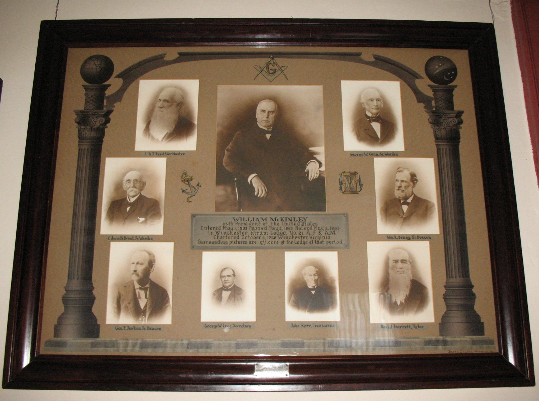 Photograph: Composite pictures of William McKinley surrounded by the officers of Winchester Hiram Lodge No. 21 A.F.& A.M. 9 photographs, matted and in a 46 1/4" x 36" frameCollection