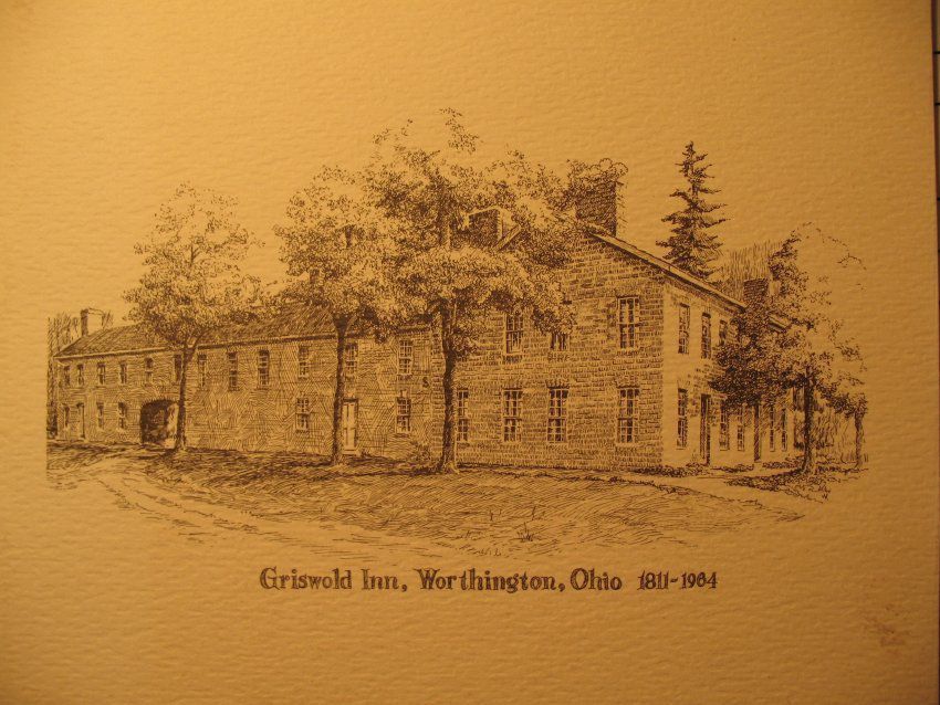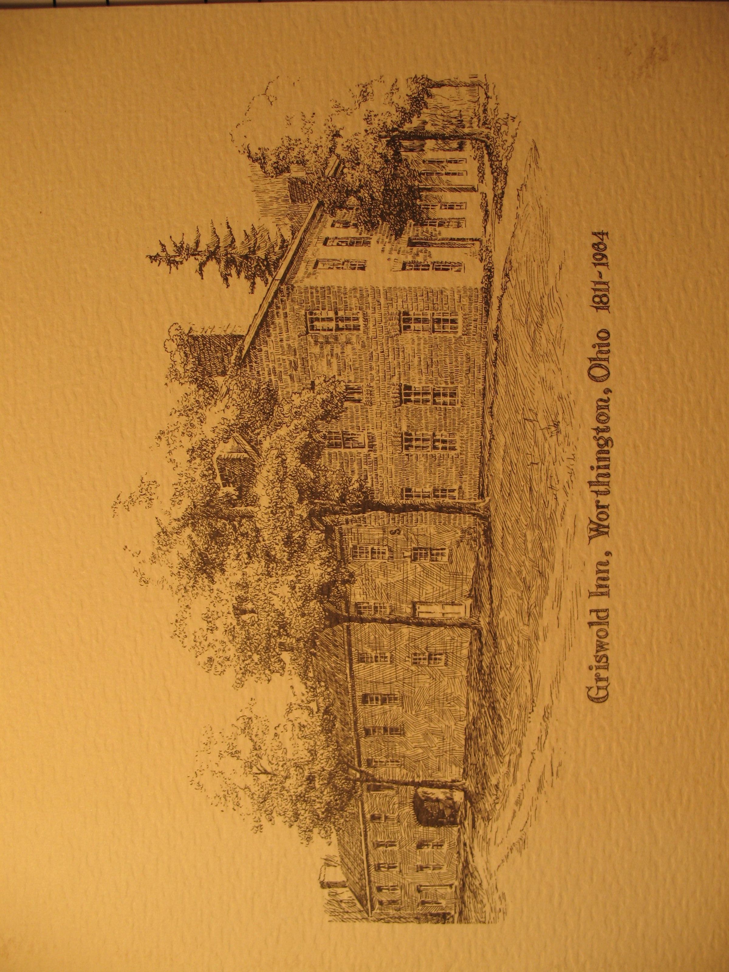 Print: Print of the Griswold Inn, Worthington, Ohio. 1811-1964. On the back "Worthington Historical Society Presents Print No. 4" 10" x 8 card paper, folded into 4 5"x 4" parts.Collection
