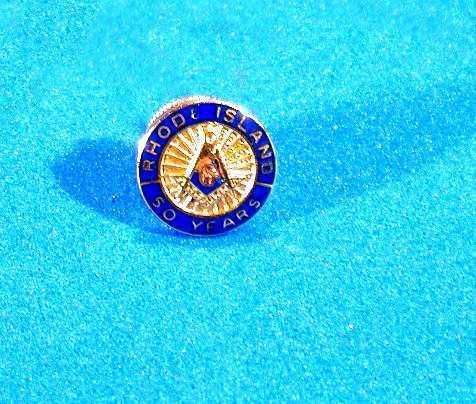 Pin, Fraternal: Lapel pin for 50 years Service from Rhode Island. 7/16" diam. Blue edge with Square & Compasses in centerCollection