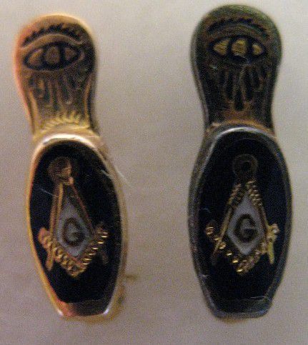 Pin, Fraternal: Slipper lapel pin. 1/2" long, gold. Has a Square and Compass and an All Seeing Eye on it.Entry/Object ID