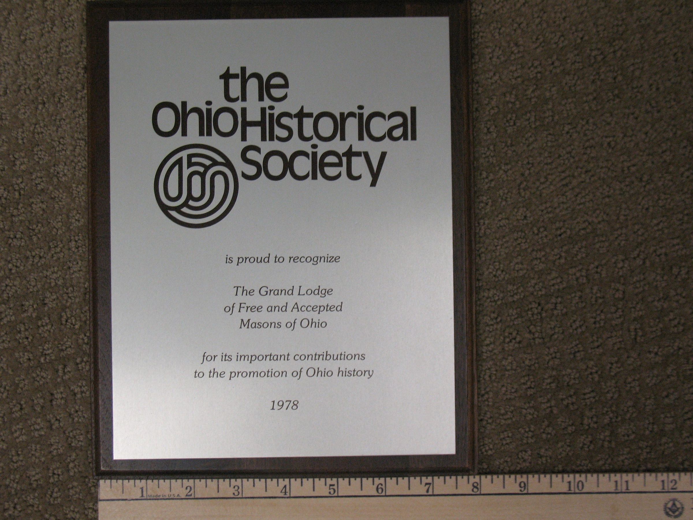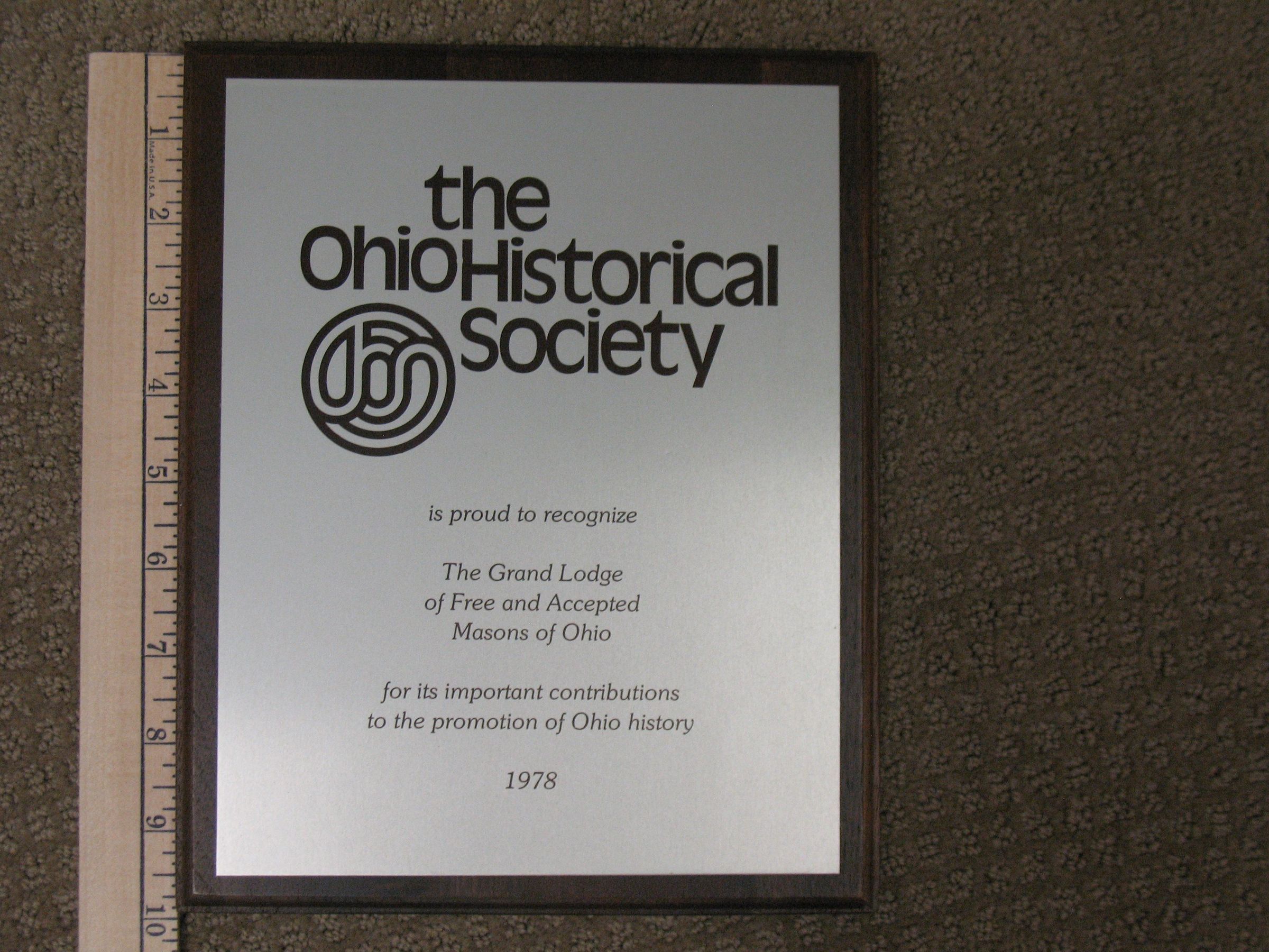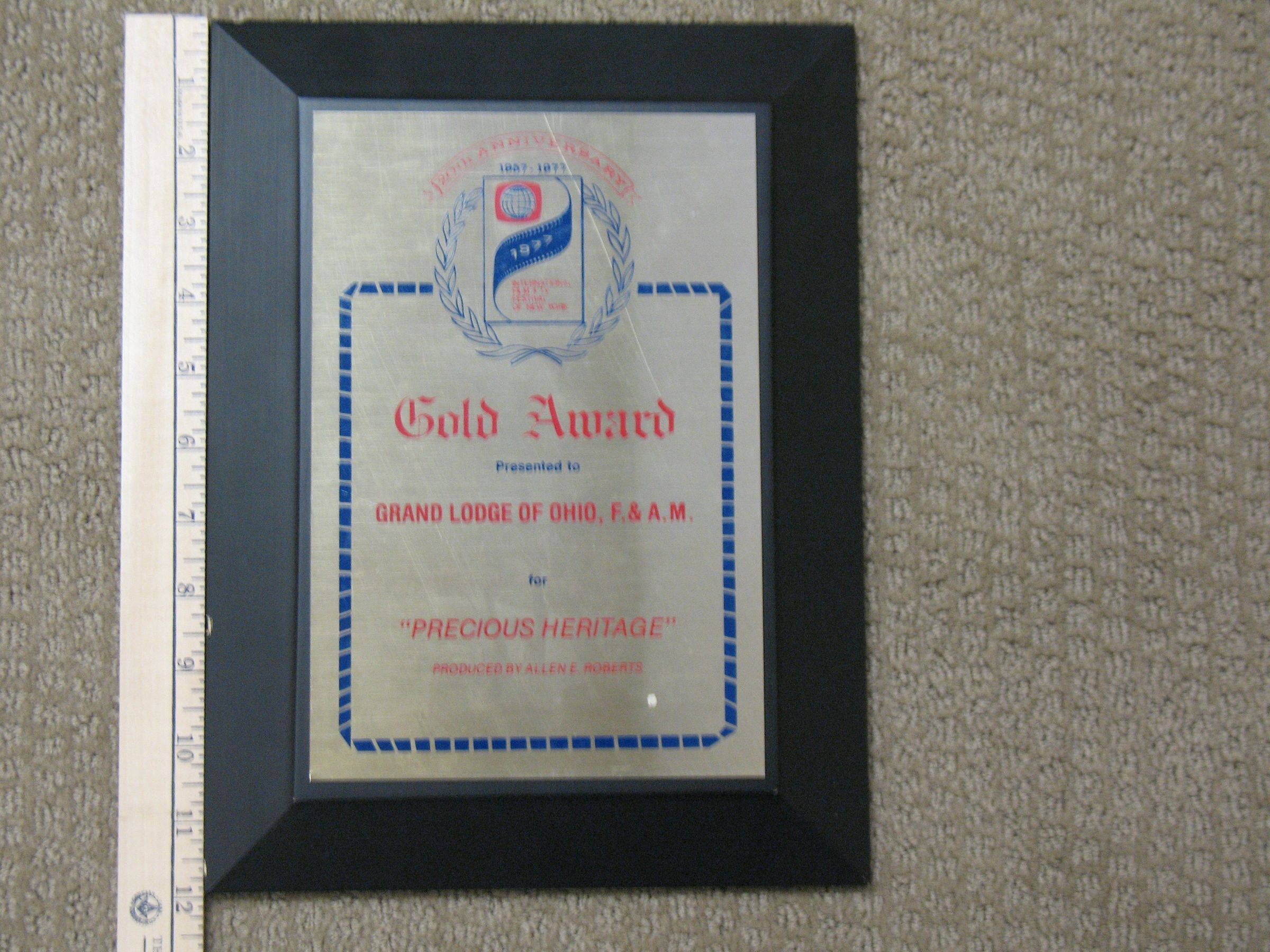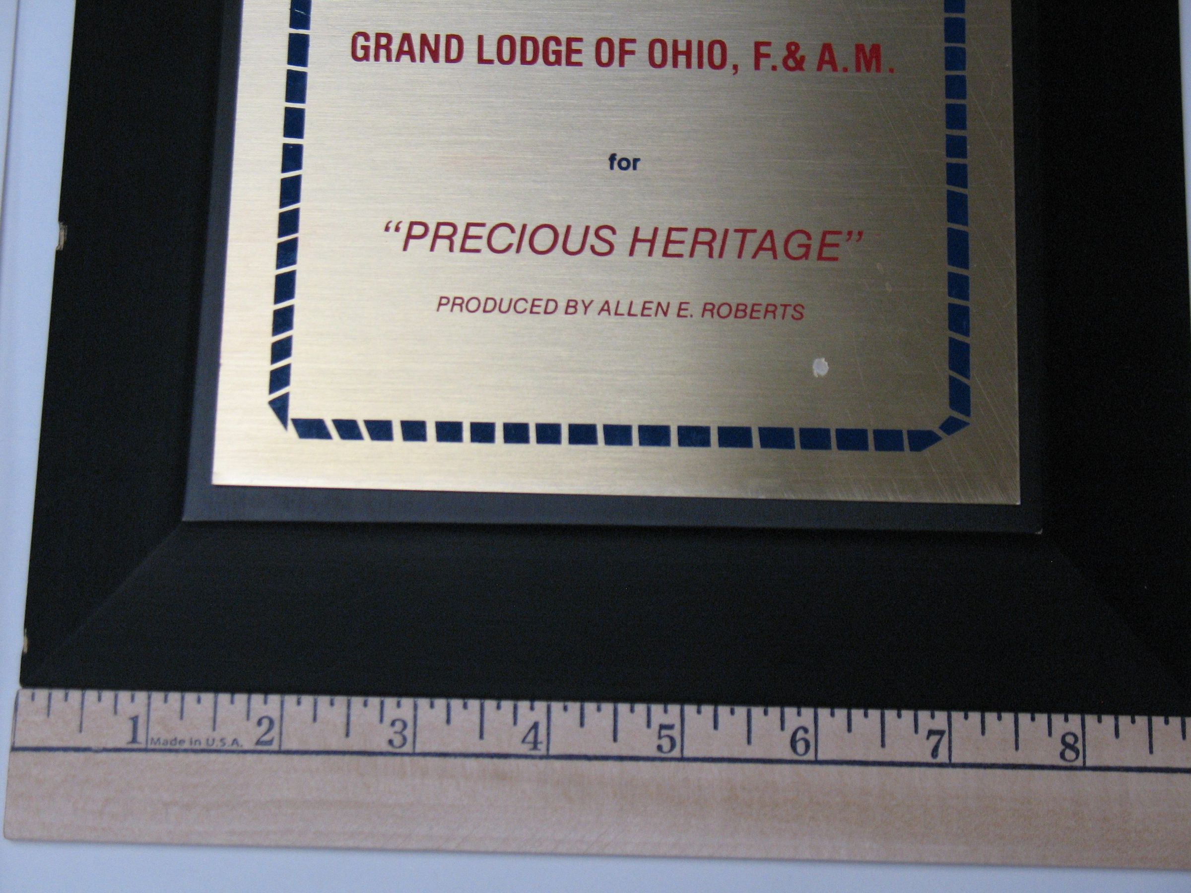 Plaque: Gold Award presented to the Grand Lodge of Ohio, F&AM for "Precious Heritage", produced by Allen E. Roberts by the International Film & TV Festival of New York.Collection