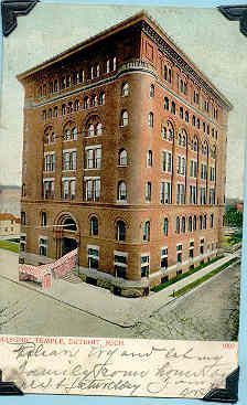 Postcard: Masonic Temple, Detroit, Michigan. Postmarked August 28, 1907. From a collection of photos of Masonic Temples, collector unknownEntry/Object ID