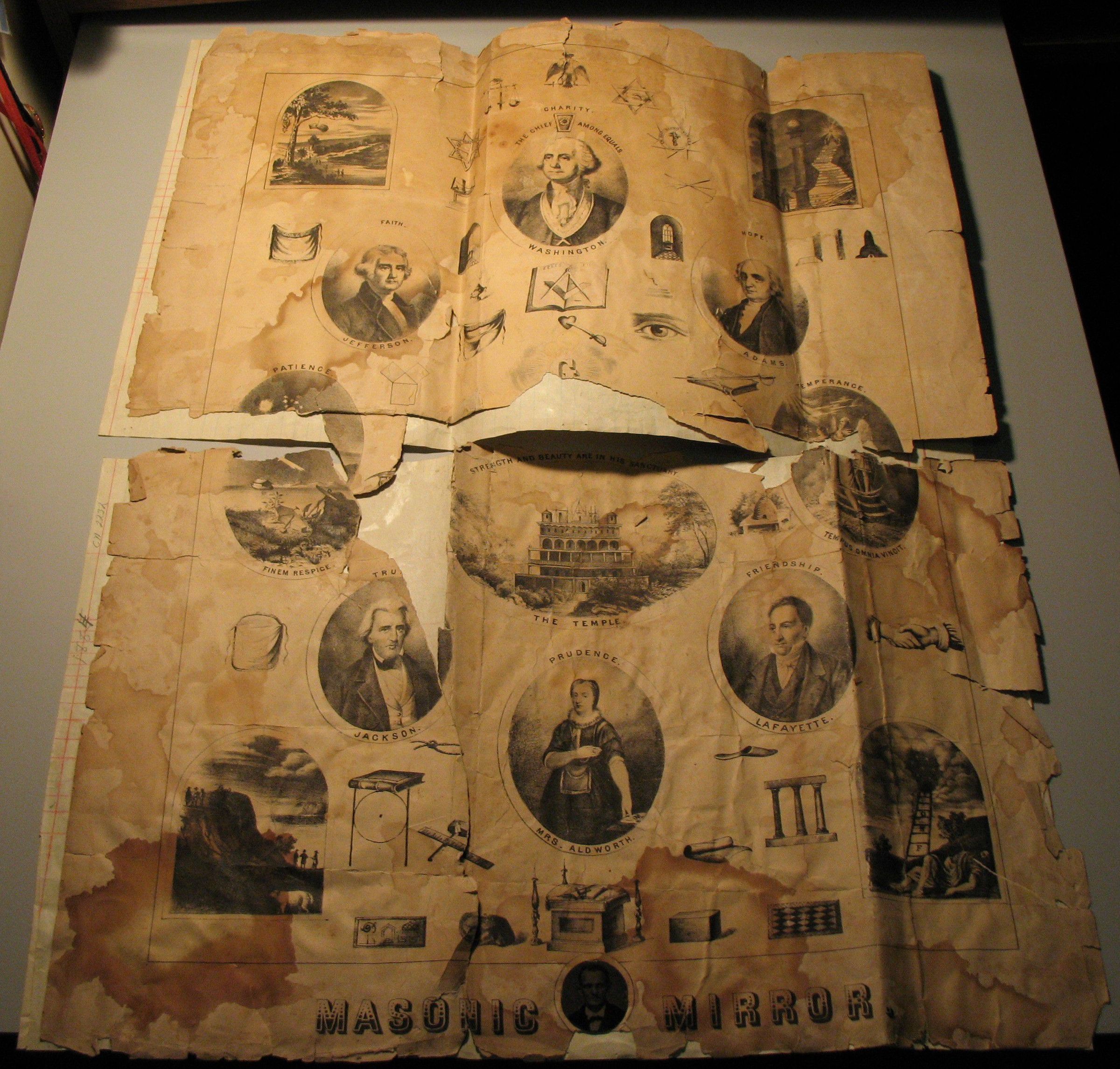 Print: Titled "Masonic Mirror" with a photo at the bottom. 24" x 18 1/2", black and white. The print is glued to paper and in two pieces.Collection