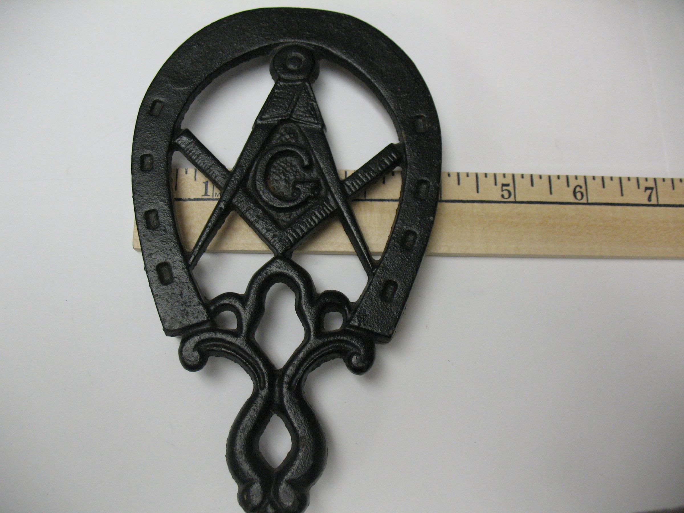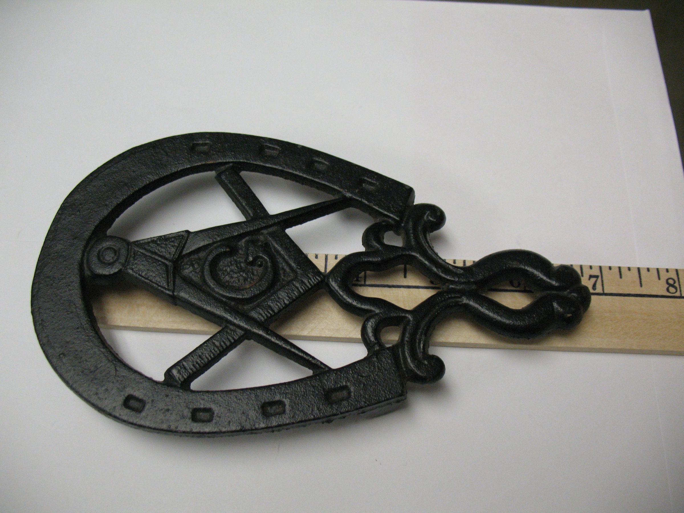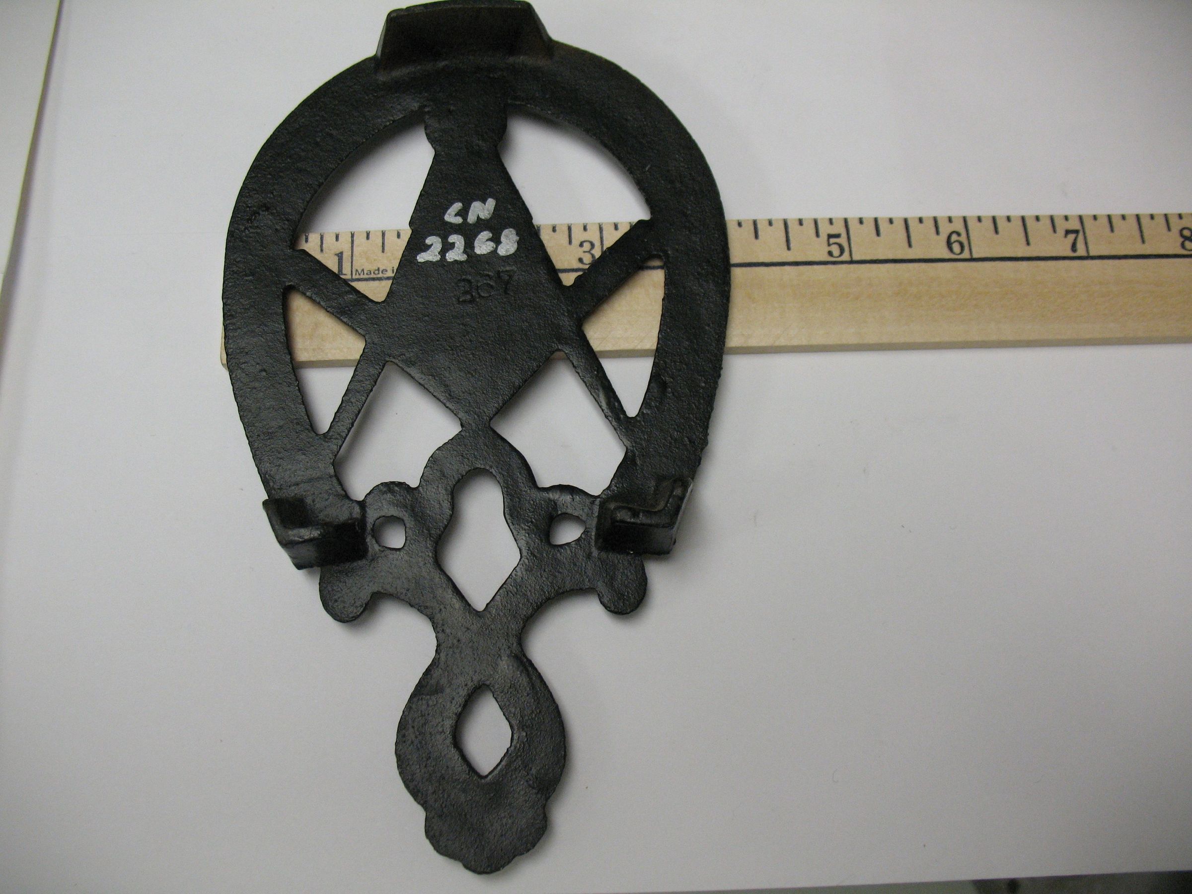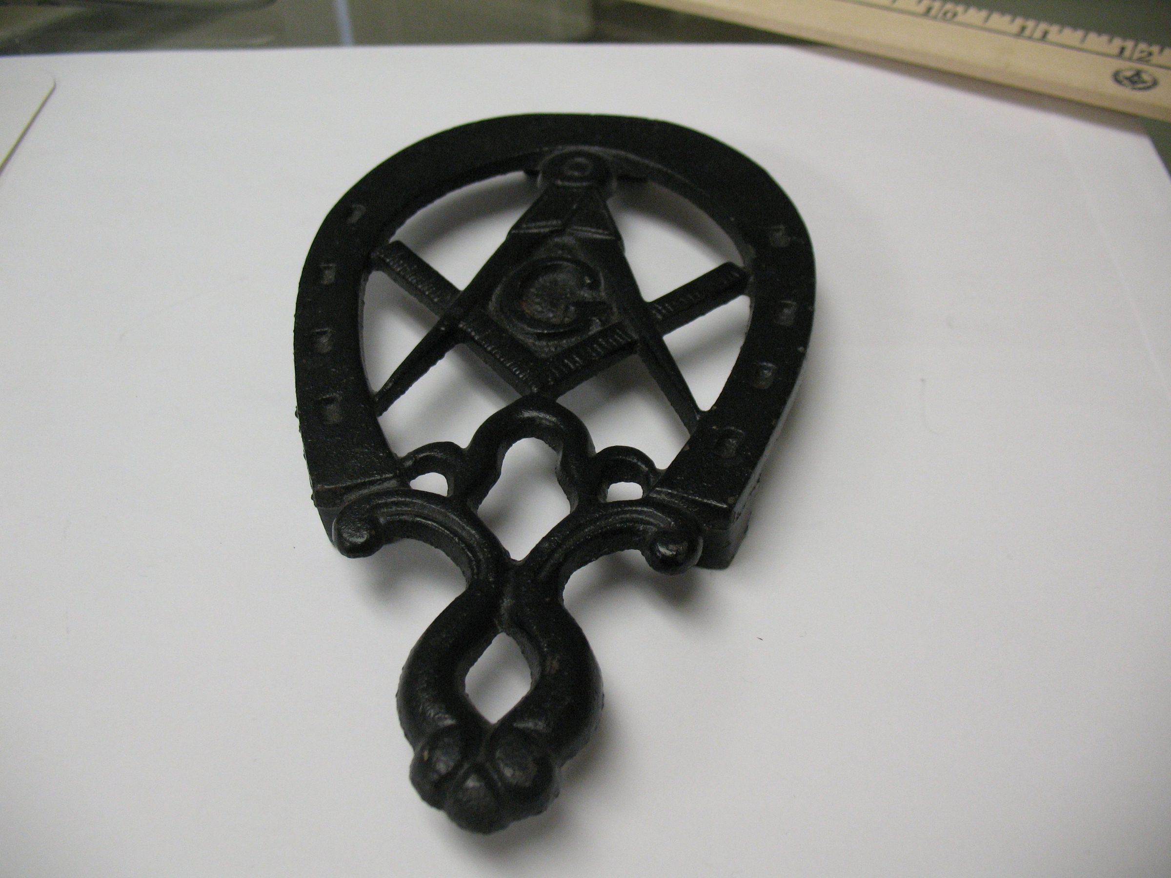 Trivet: Horseshoe shaped trivet made of cast iron with square and compass i center. Castin No. 267Entry/Object ID