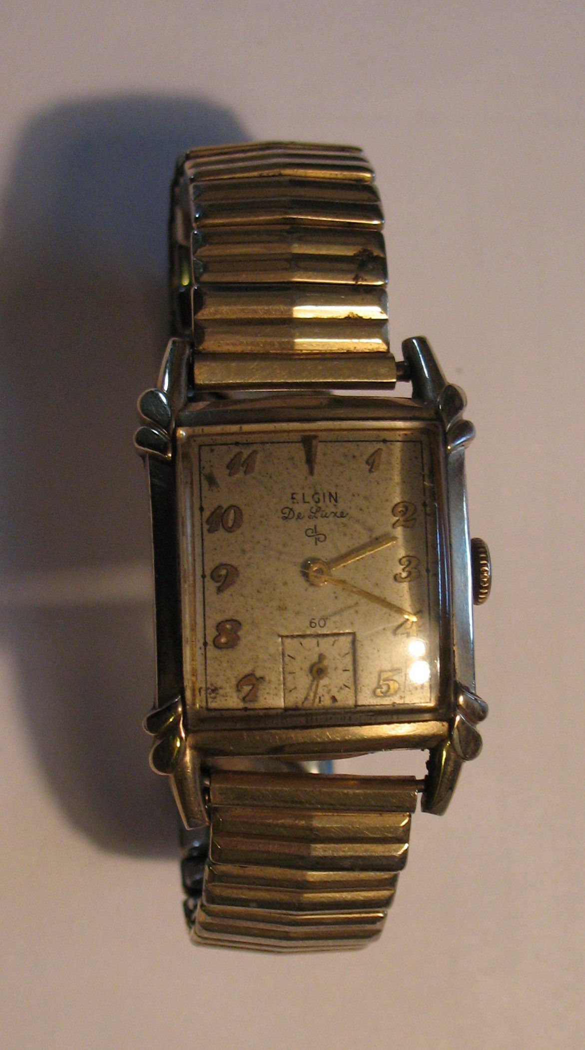 Wristwatch: Gold Elgin wristwatch with square face. Inscription on the back reads: "Presented by Sencerity Lodge No. 694 F&AM to Russell O. Hotchkiss 26th P.M. 1950"Collection