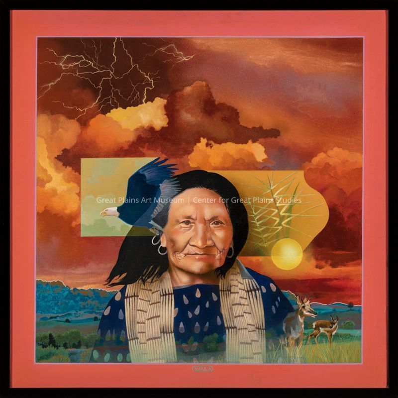 Native peoples, Animals, Clouds, Birds, Eagles, Birds of prey, Prey, Birds of, Grassland, Storms, Lightning, Landscapes (Representations), Men, Mountains, Landforms, Portrait paintings, Portraits, Symbols, Antelopes