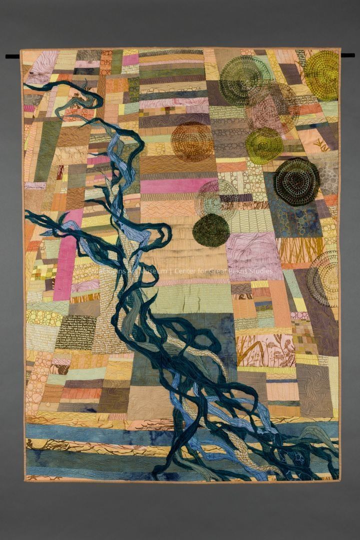Machine pieced with relief-printed, intaglio-printed, naturally dyed and synthetically dyed cotton; synthetic fabric; machine and hand appliqué