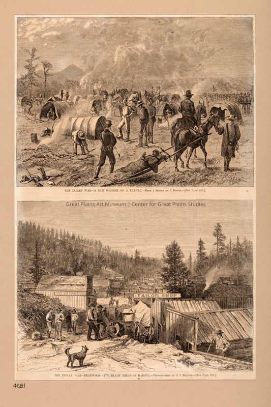 Animals, Horses, Dogs, Men, Women, People, Cities & towns, Buildings, Wood buildings, Westward expansion, Gold rushes, Settlers, Trees, Hills, Landforms, Conflict, Wars, Guns, Firearms, Weapons, Flags, Fires, Smoke, Travois, Transportation, Horseback riding, Campaigns, Military, Magazine illustrations, Native peoples, Stores & shops, Business & finance, Streets